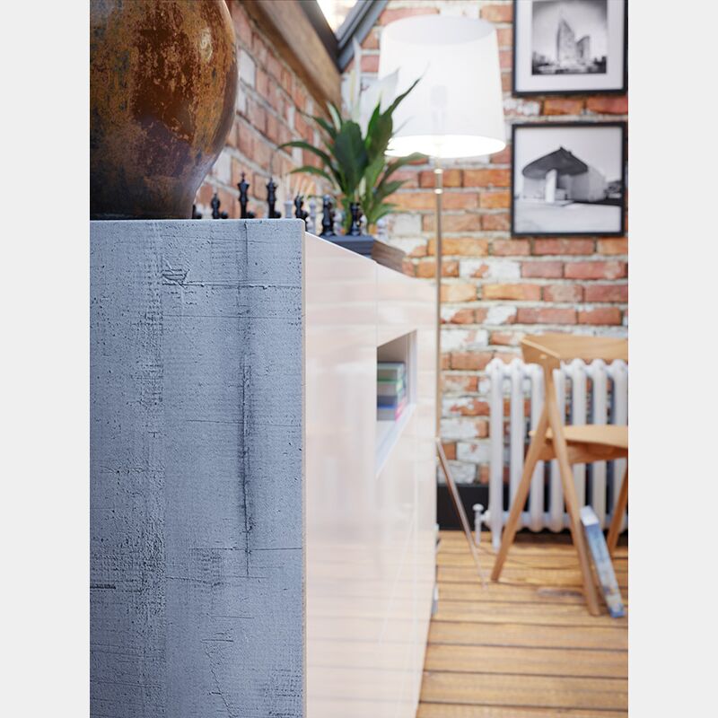 La parete attrezzata è composta da una base tv formata da 3 cassetti che viene collegata ad una ribalta attraverso un porta riviste. Dal porta riviste si alza un pannello dotato di due mensole. Le finiture della parete attrezzata sono Bianco lucido per frontali e Grigio loftwood per i frontali, questa contrapposizione di tonalità assicura un mobile capace di personalizzare la stanza.