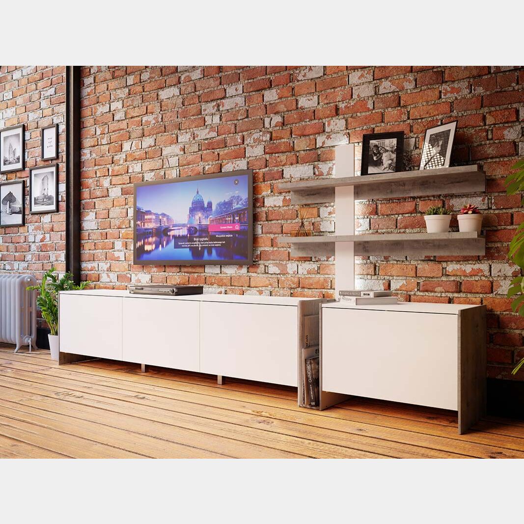 Parete attrezzata con base tv e mensole, Bianca lucido e Grigio loftwood