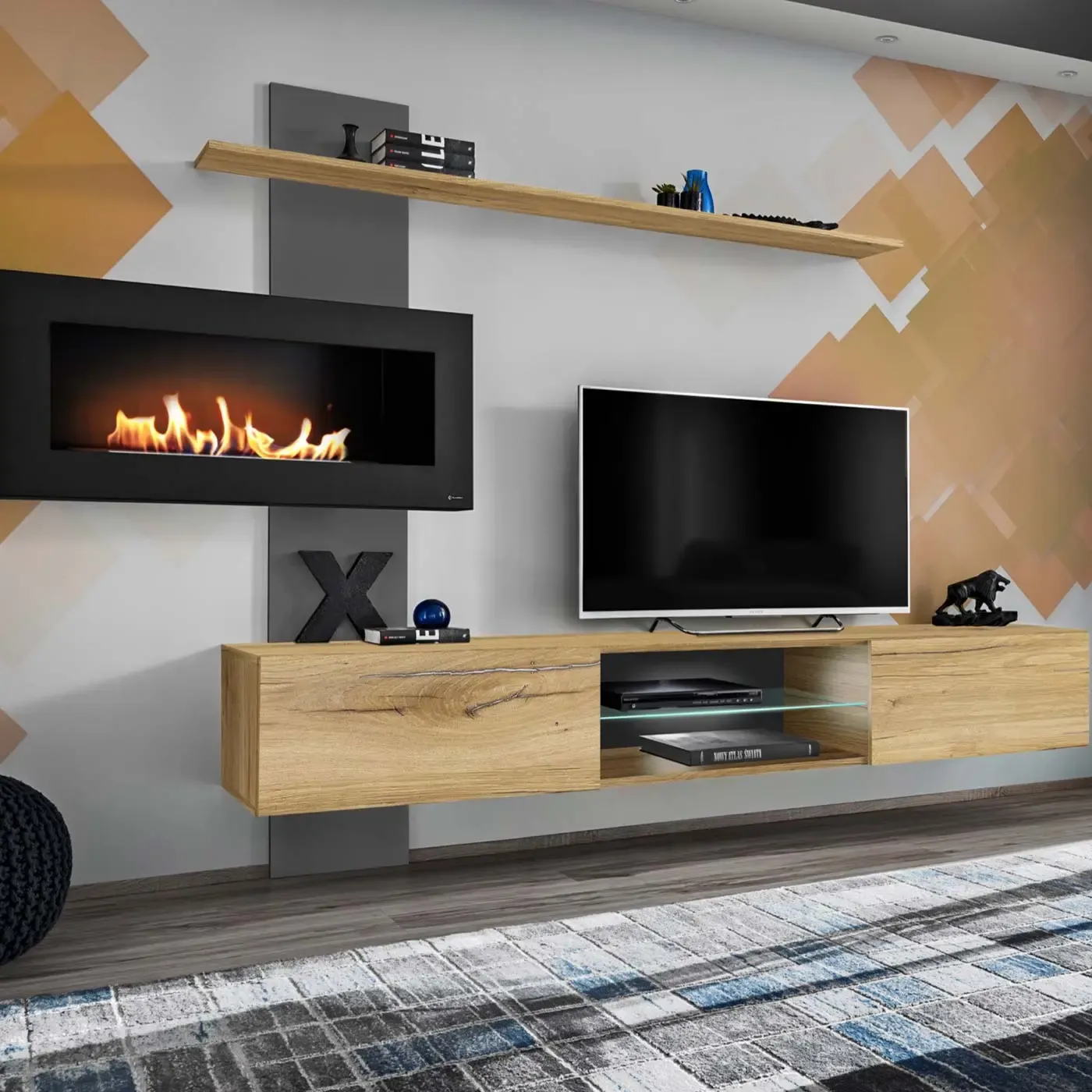 Essa si compone di un porta TV a 2 ante particolarmente spazioso che al suo interno possiede 1 ripiano in vetro e 2 vani contenitori interni per vari tipi di oggetti (libri, riviste, articoli d'elettronica,...). Assieme alla mensola lunga risulta utile anche per esporre soprammonili di design, consolle o anche dispositivi elettronici. La caratteristica principale di questa parete è però l'inclusione di un biocaminetto sospeso per abbellire ancora di più il salotto.