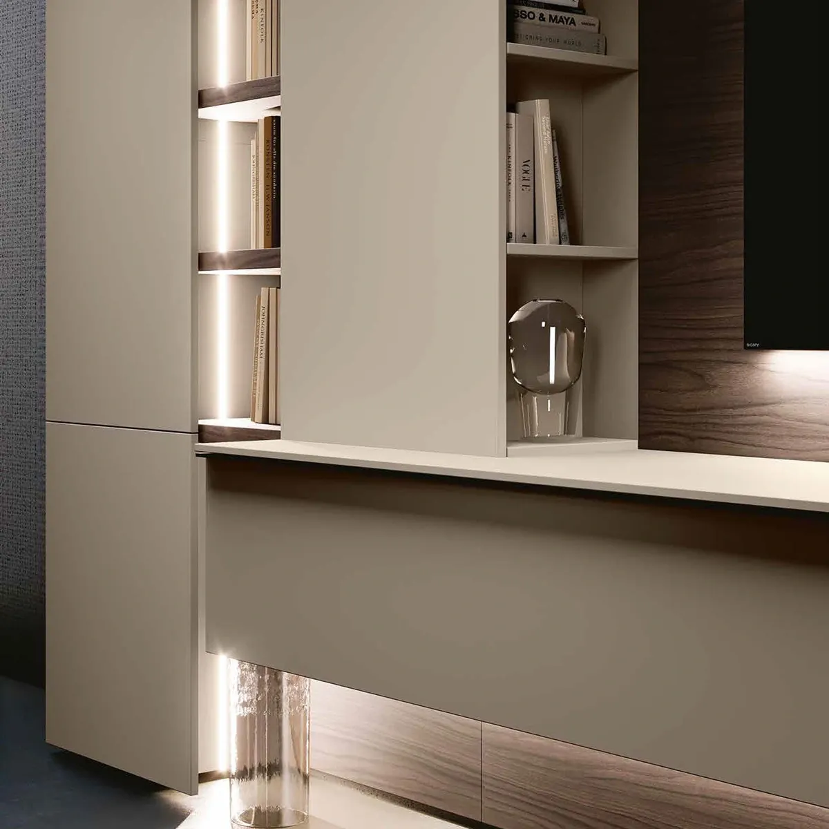 Moderna e con carattere la parete attrezzata arreda ogni living moderno offrendo eleganza e spazio contenitivo. Ogni singolo elemento che compone la parete è progettato per assicurare un'ampia capienza per oggetti di uso quotidiano e soprammobili, che personalizzano l'ambiente.