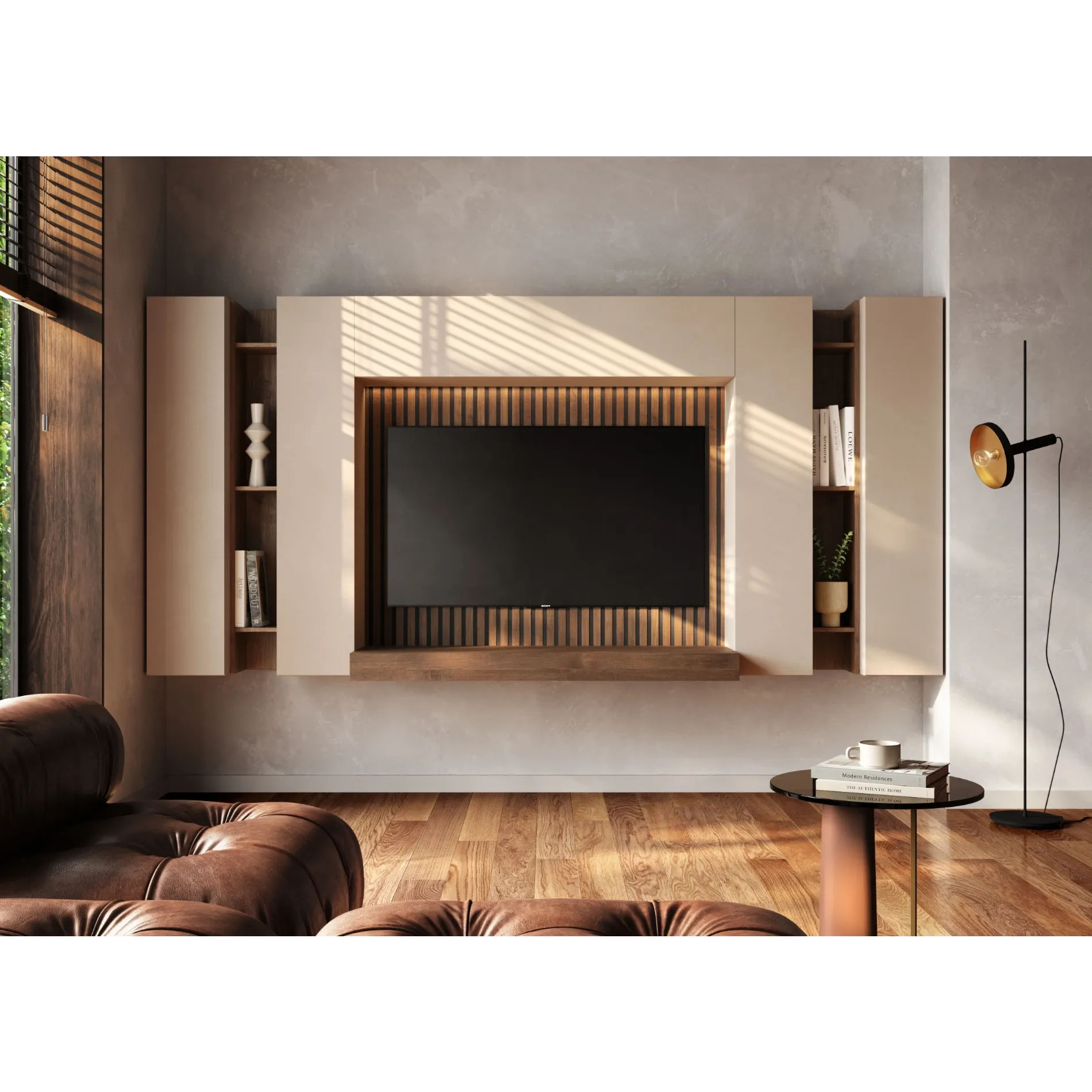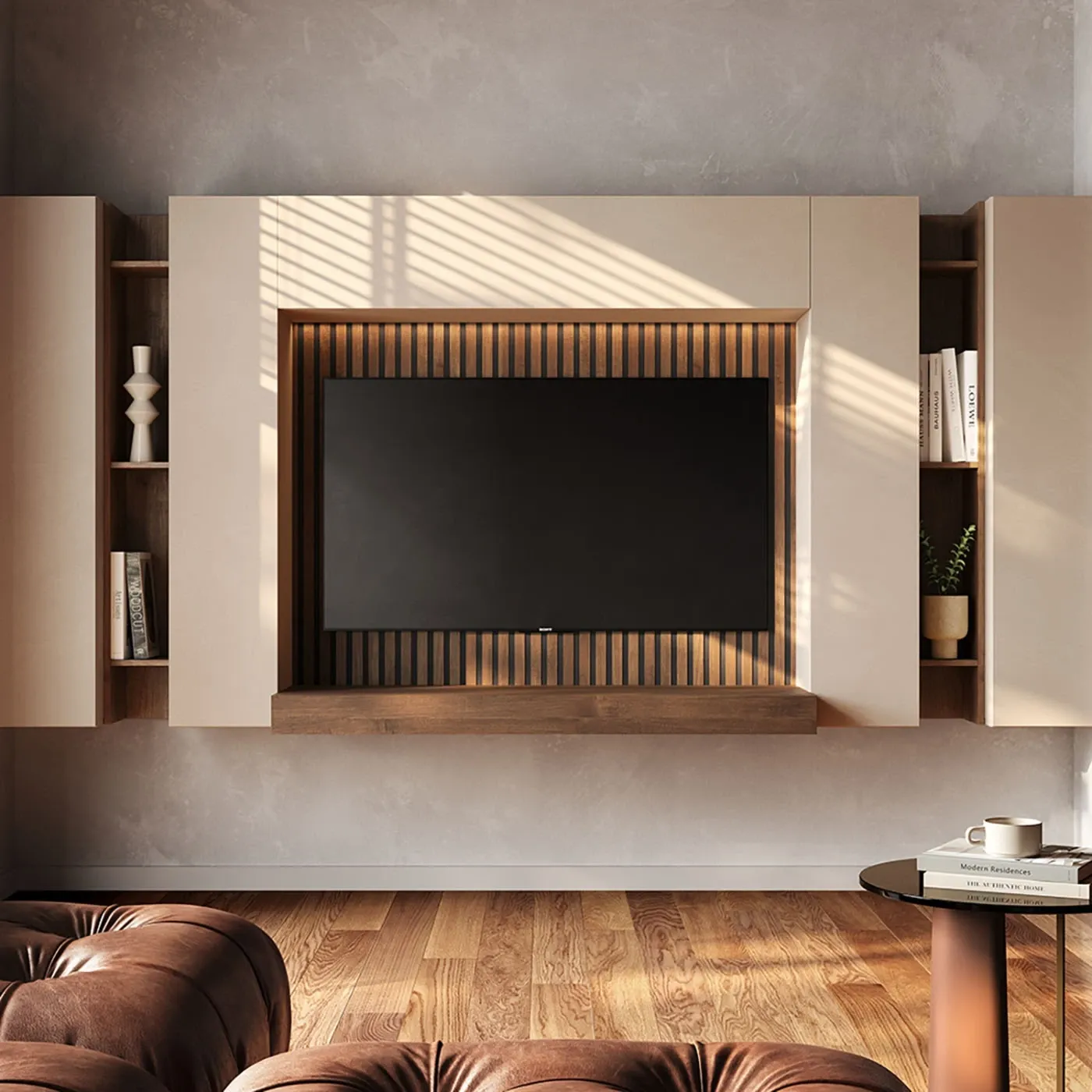 Parete attrezzata con ribalte e boiserie cannettata in rilievo, Cashmere e Mercure cannettato, L.273 H.138 P.30
