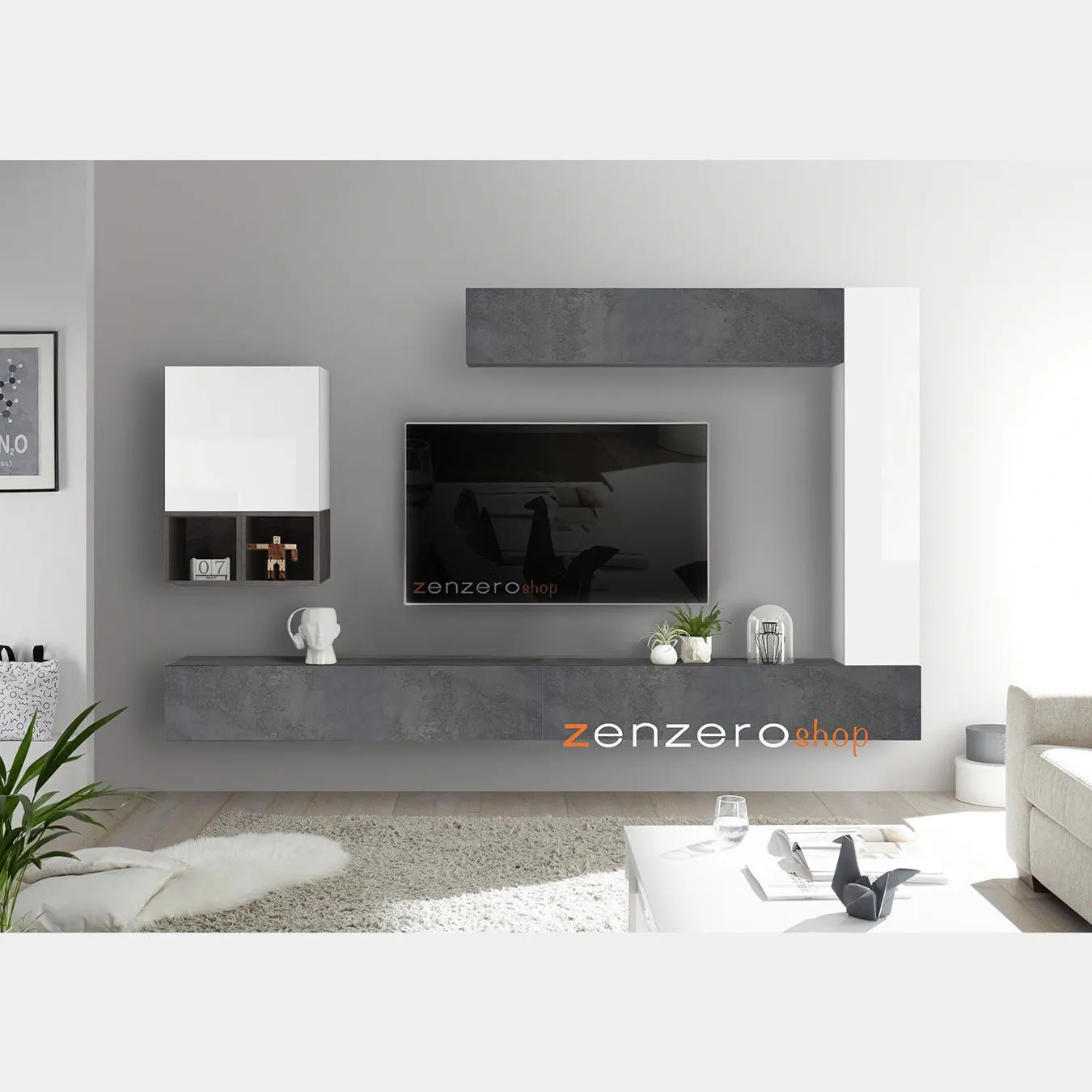 Soggiorno moderno Zenzero, parete attrezzata con con ribalte, pensili, cubi e vani a giorno
