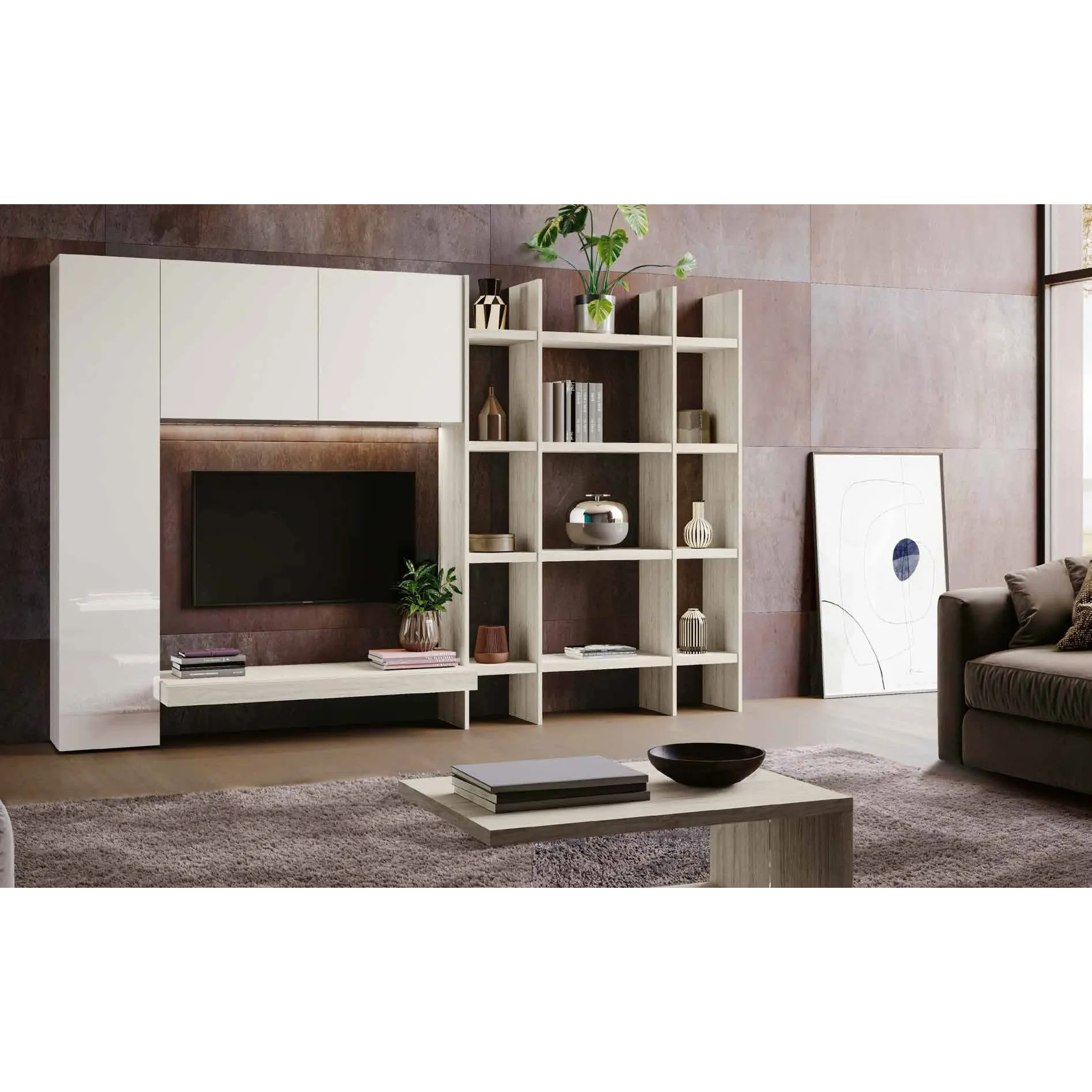 La base è ideale per organizzare oggetti di uso quotidiano, mentre i pensili e i vani a giorno offrono spazio per libri, decorazioni e dispositivi elettronici. La libreria laterale, con i suoi ripiani a giorno, funge da punto focale decorativo e aggiunge un tocco di originalità alla composizione.