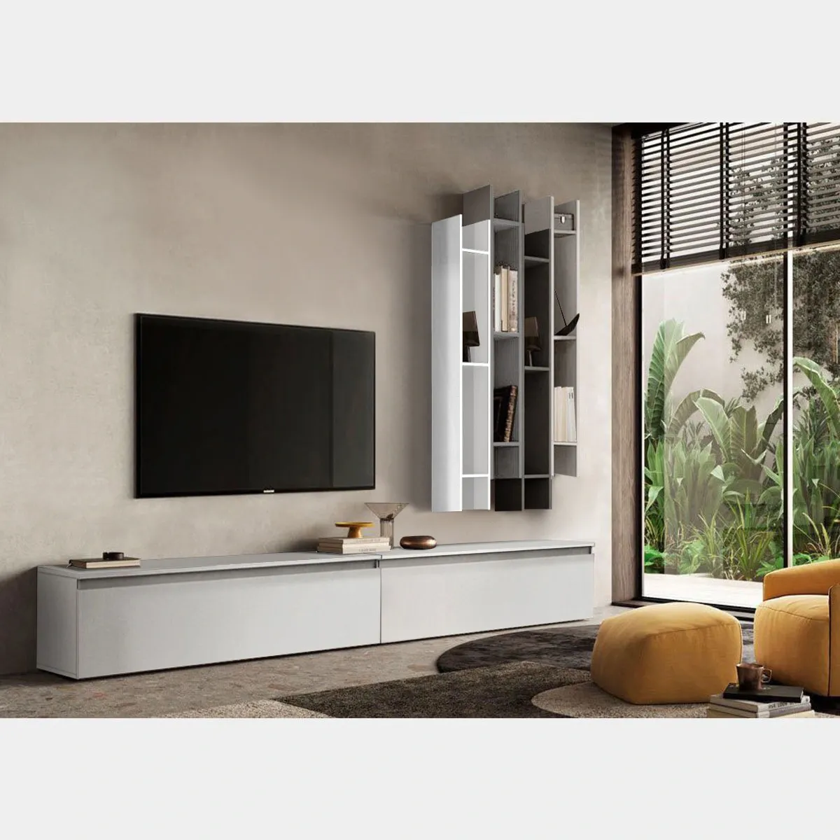 La parete è composta da due elementi a terra con cassetti, perfetti per riporre piccoli oggetti, libri e telecomandi e da quattro librerie nella quale si possono posizionare complementi d'arredo che personalizzano il living.