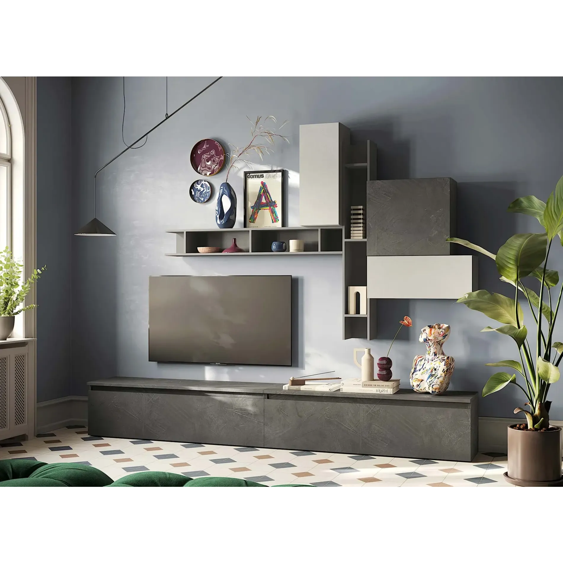 I numerosi elementi che compongono la parete offrono un ampio spazio contenitivo per accessori della televisione, libri, soprammobili e molto altro.