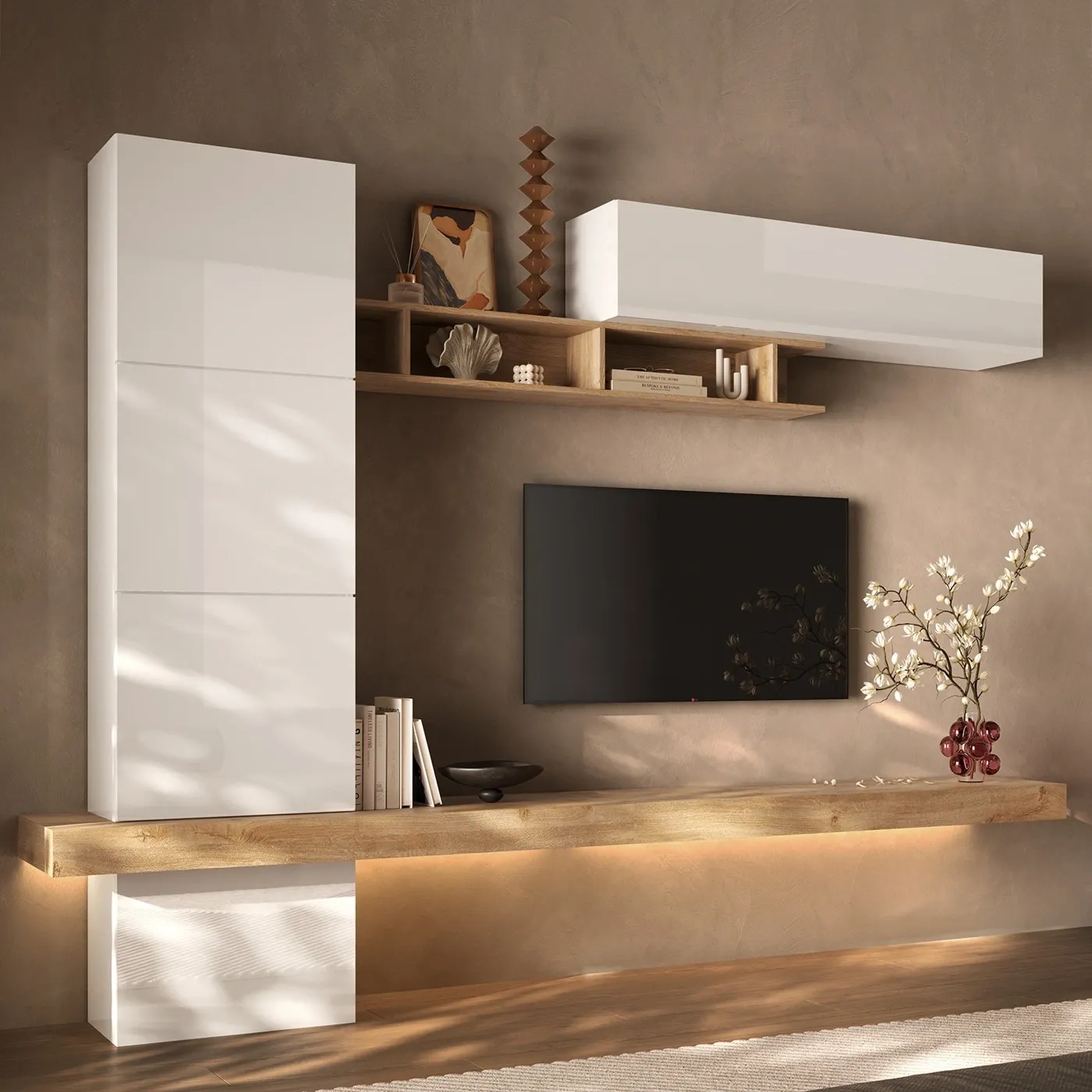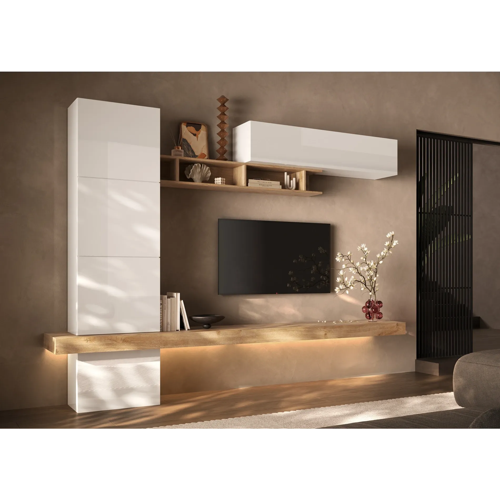 La parete è un vero capolavoro di modularità: ci sono moduli sospesi, alcuni aperti per esporre i tuoi libri e oggetti preferiti, altri chiusi per tenere tutto in ordine. Scopri tutta la nuova collezione Logica!