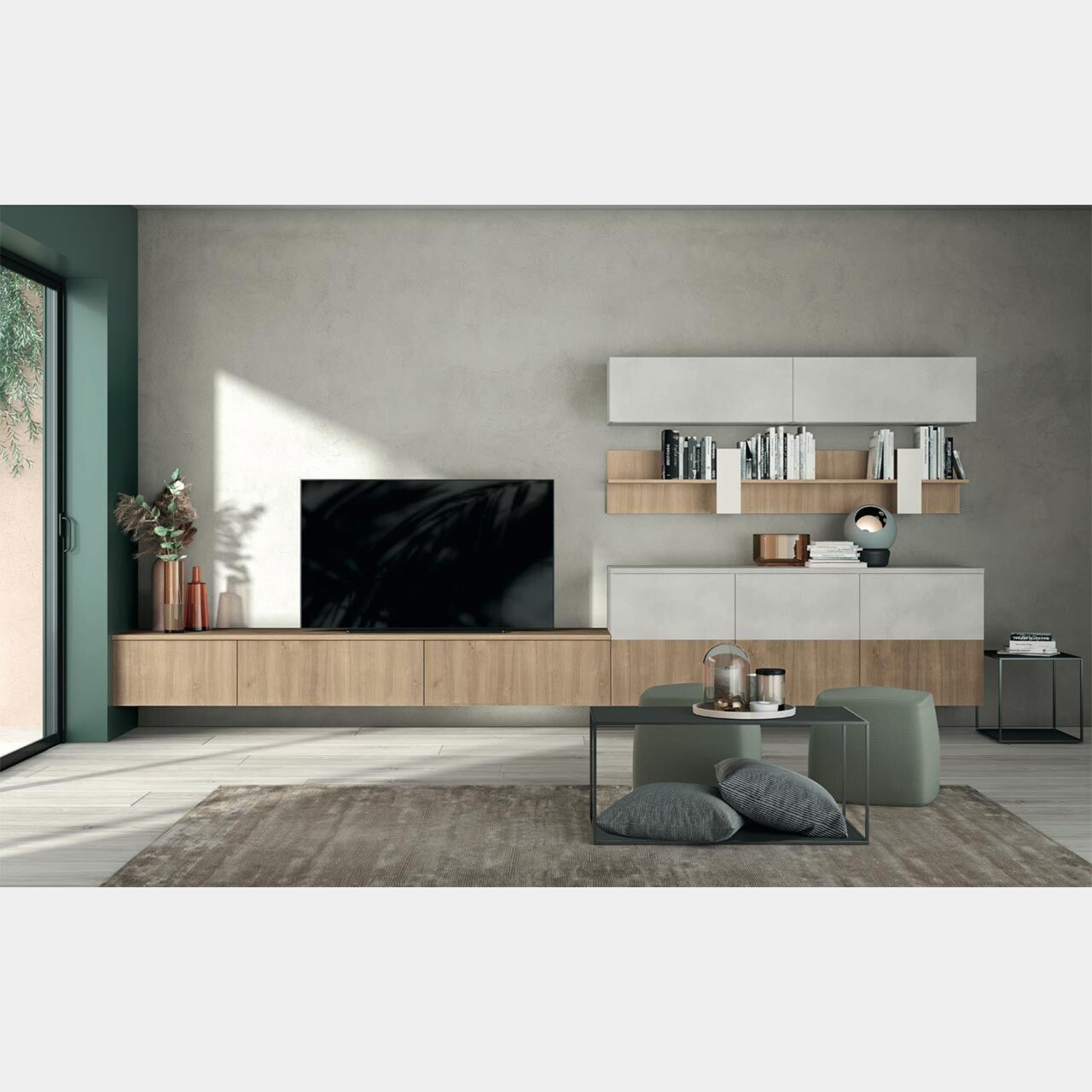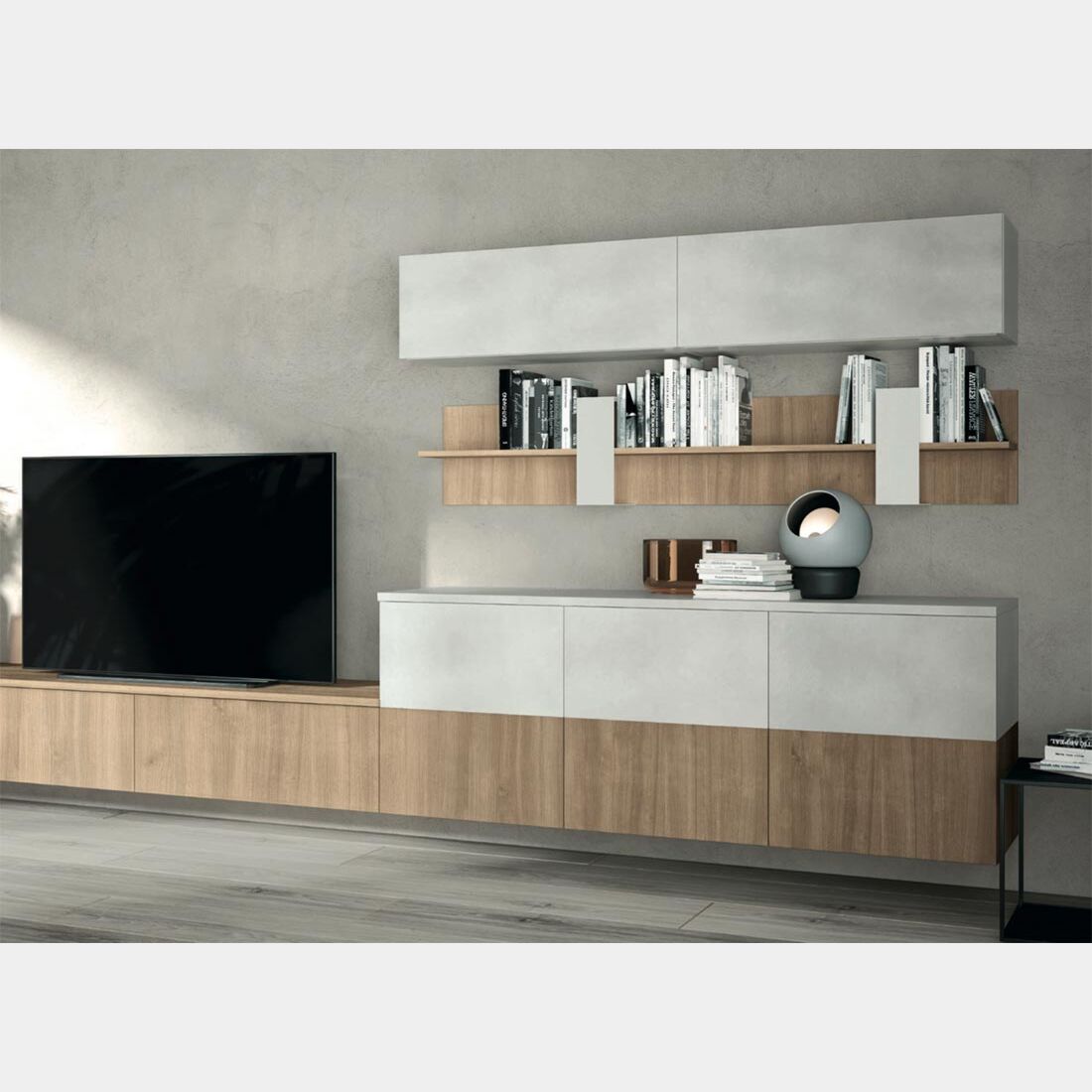 Parete attrezzata con pannelli attrezzati in finitura Royal Oak e Cemento artico
