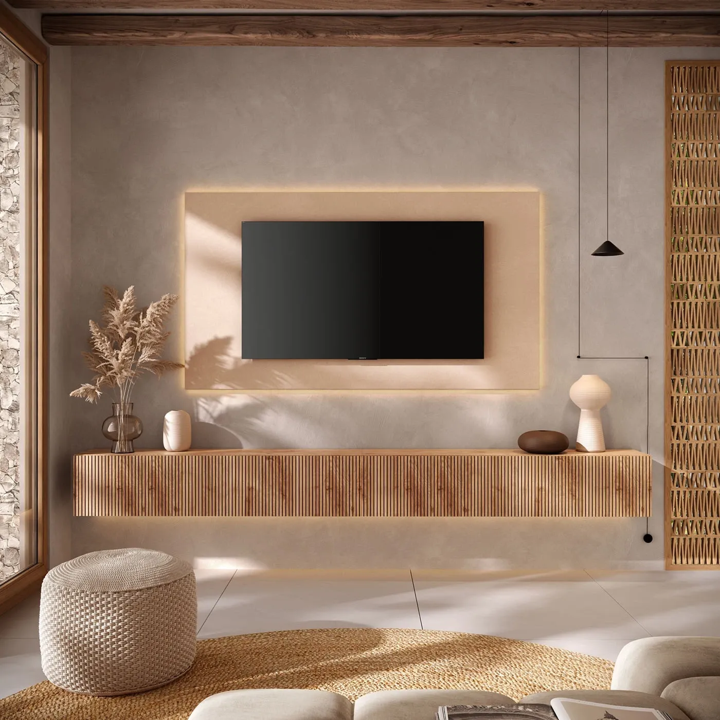 Parete attrezzata per il salotto che si compone di un pannello in legno con supporto per il televisore e di 2 ribalte in Cadiz cannettato in rilievo ad un'anta e con all'interno 2 vani ciascuna.