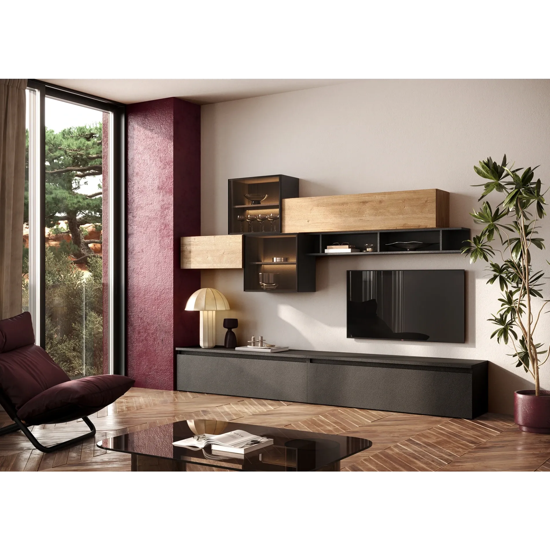 Parete attrezzata con pensili ante vetro, Lava e Cadiz, L.276