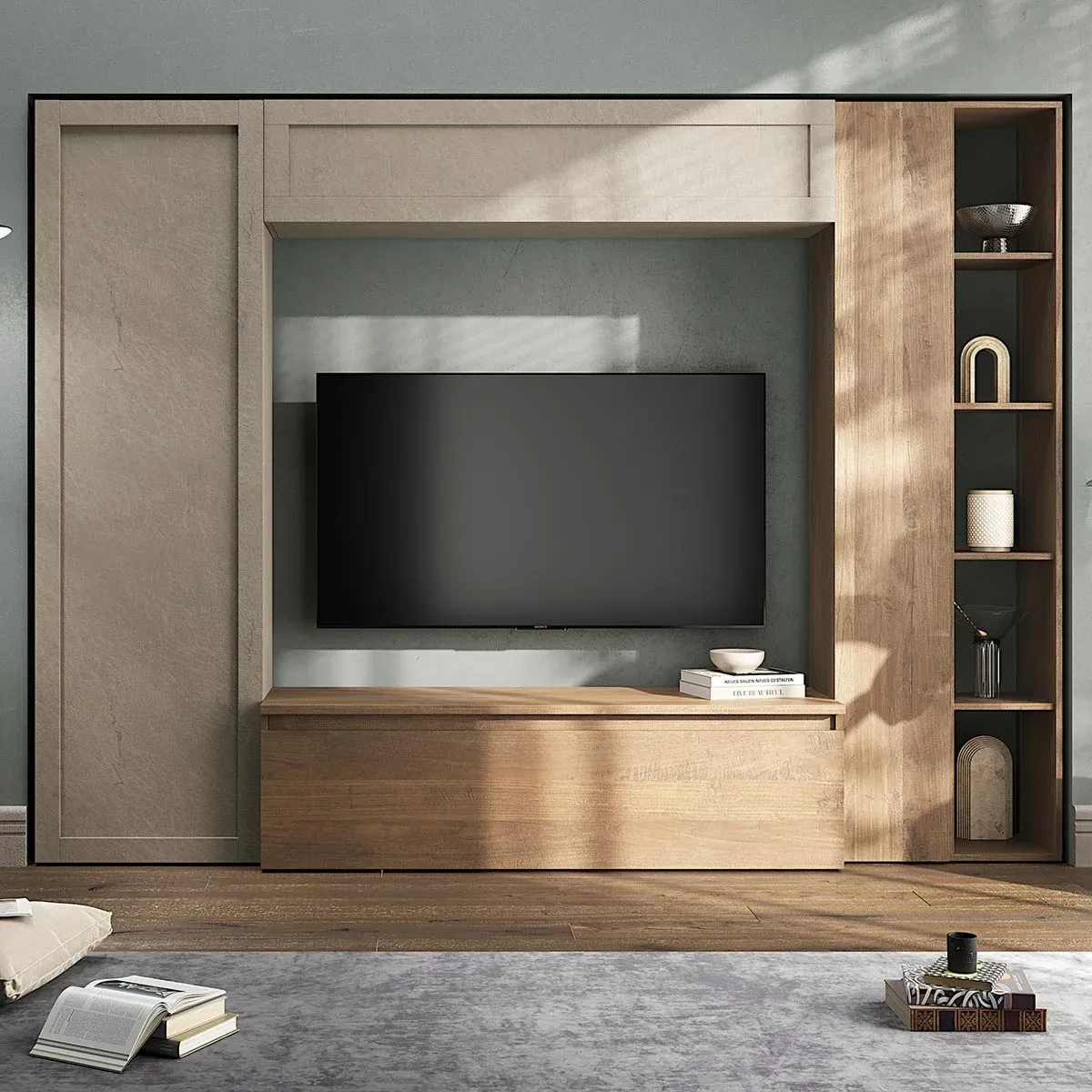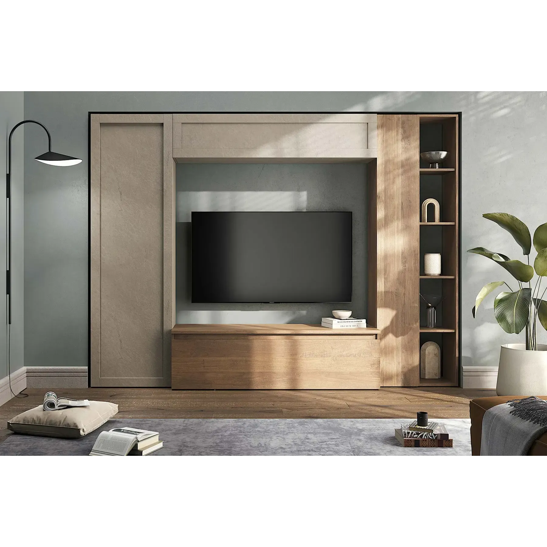 La parete attrezzata presenta uno stile contemporaneo, che viene valorizzato da ante con telaio e dalle finiture Argilla e Mercure.