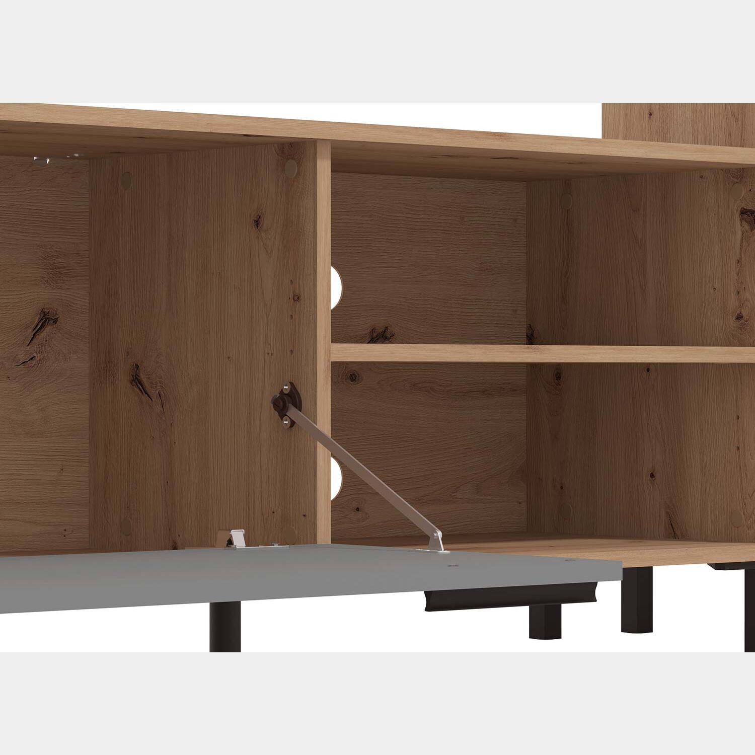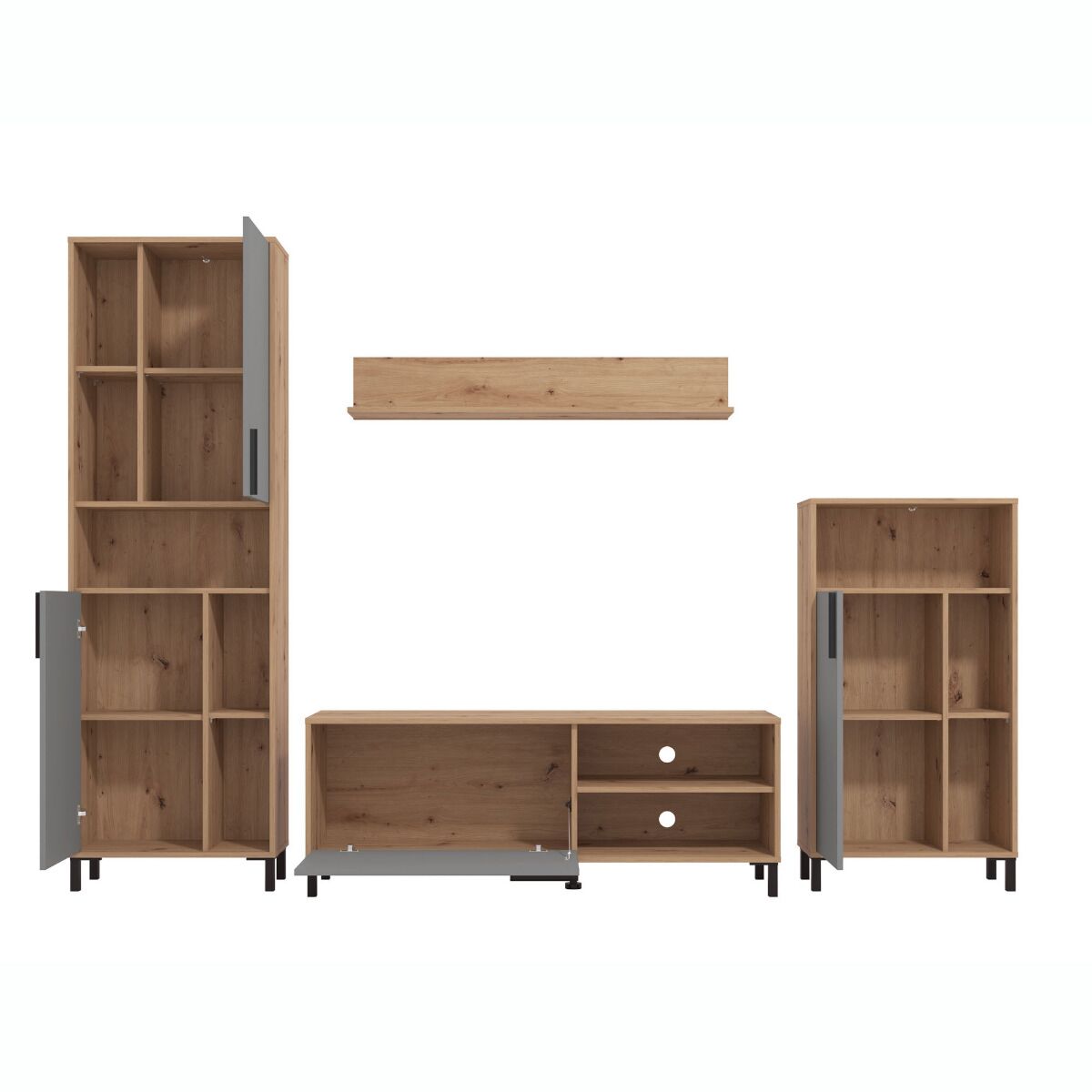 La parete attrezzata è composta da una madia alta dotata di ripiano centrale e vano a giorno superiore, un porta tv con anta a ribalta ripiano a giorno con schienale con foro passacavi, una mensola ed una colonna alta con due ante dotate di ripiano centrale e vano a giorno.