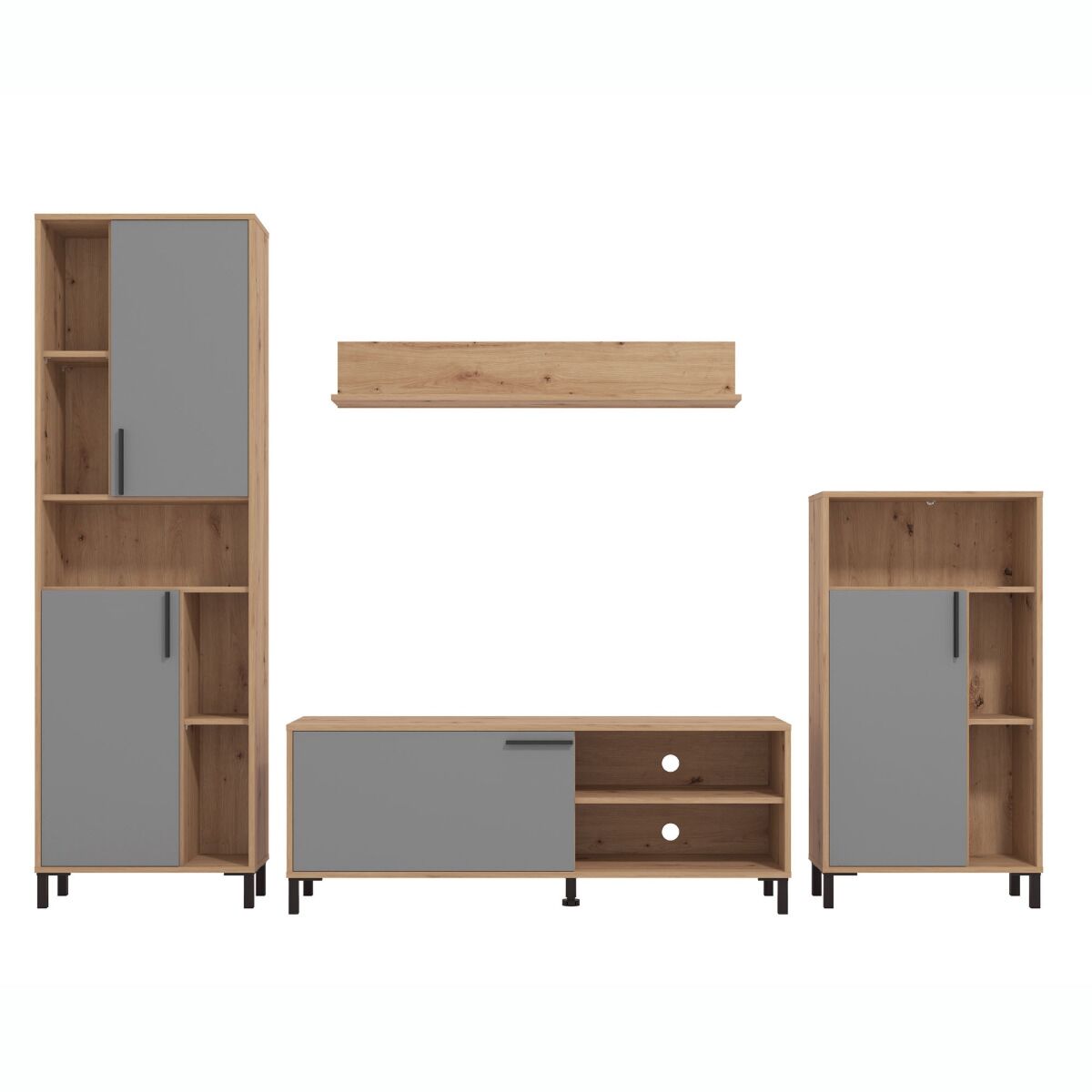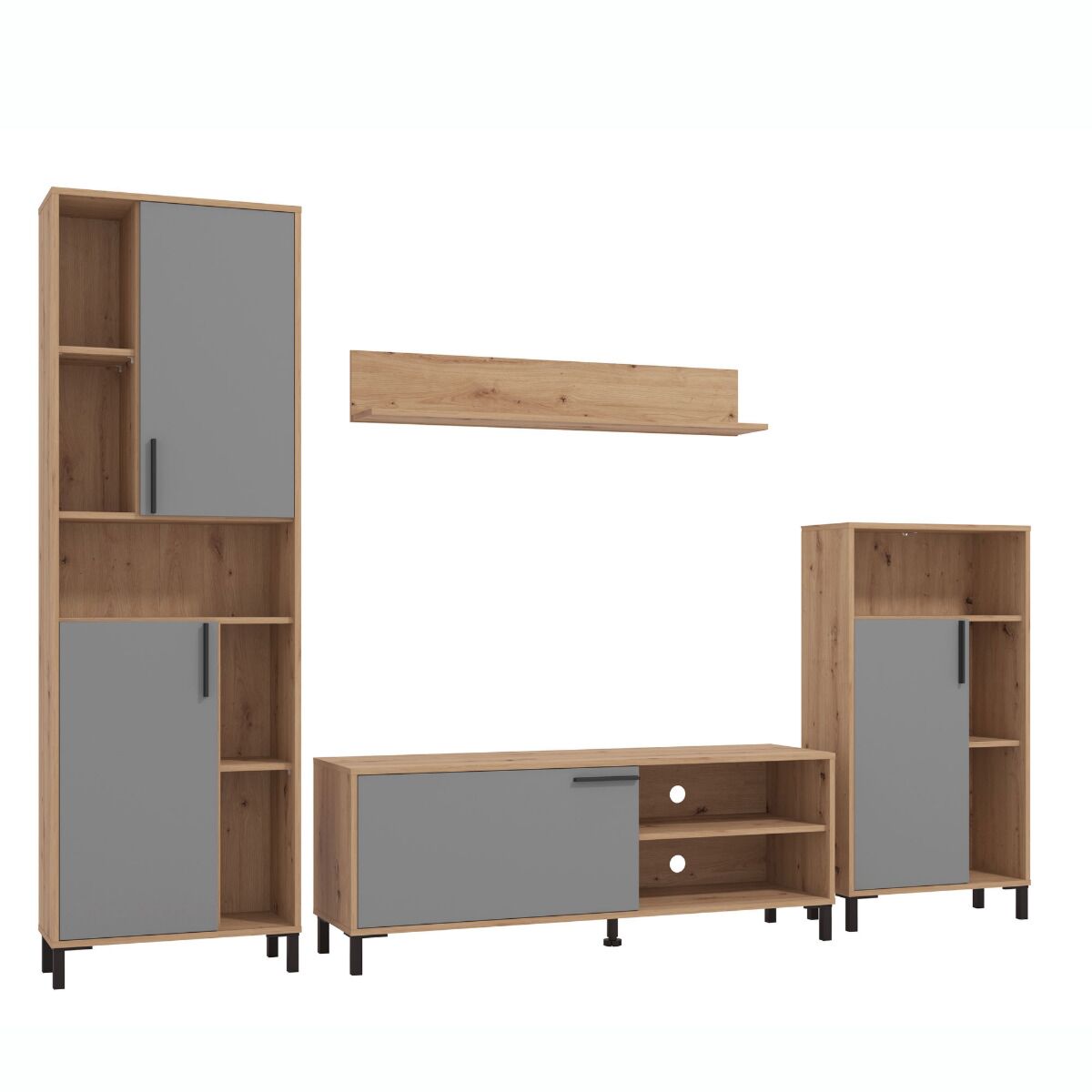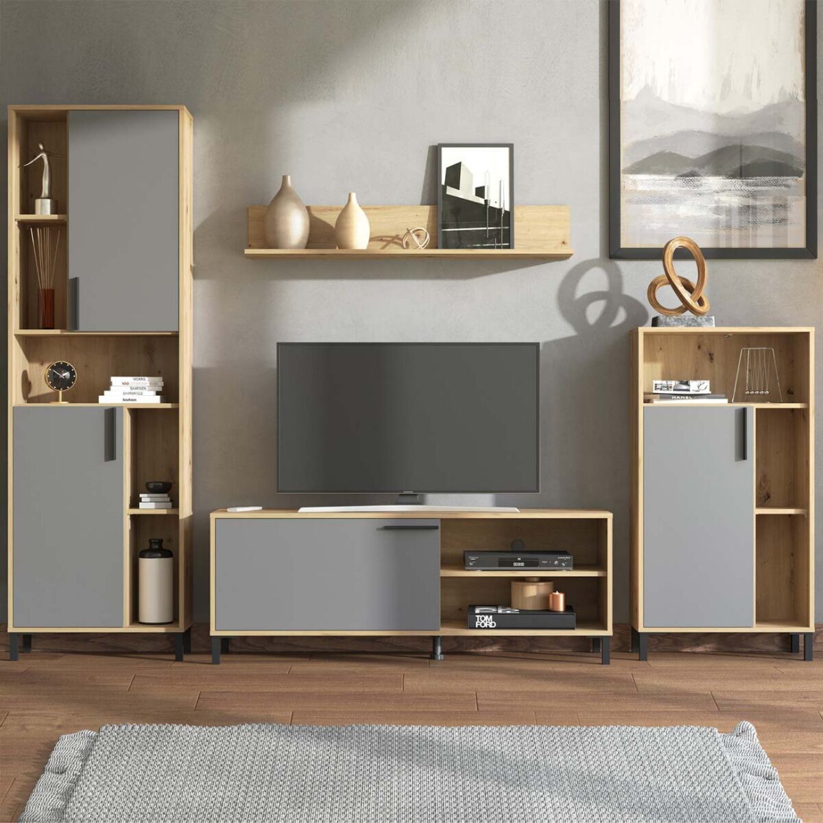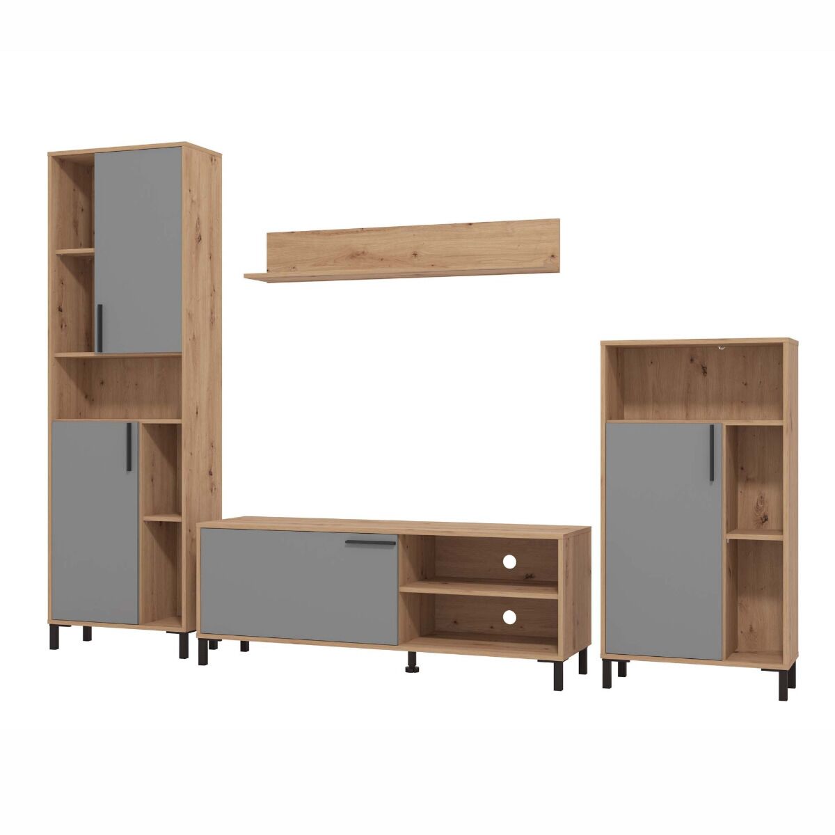 Parete attrezzata con piedini, finitura Grigio e Rovere