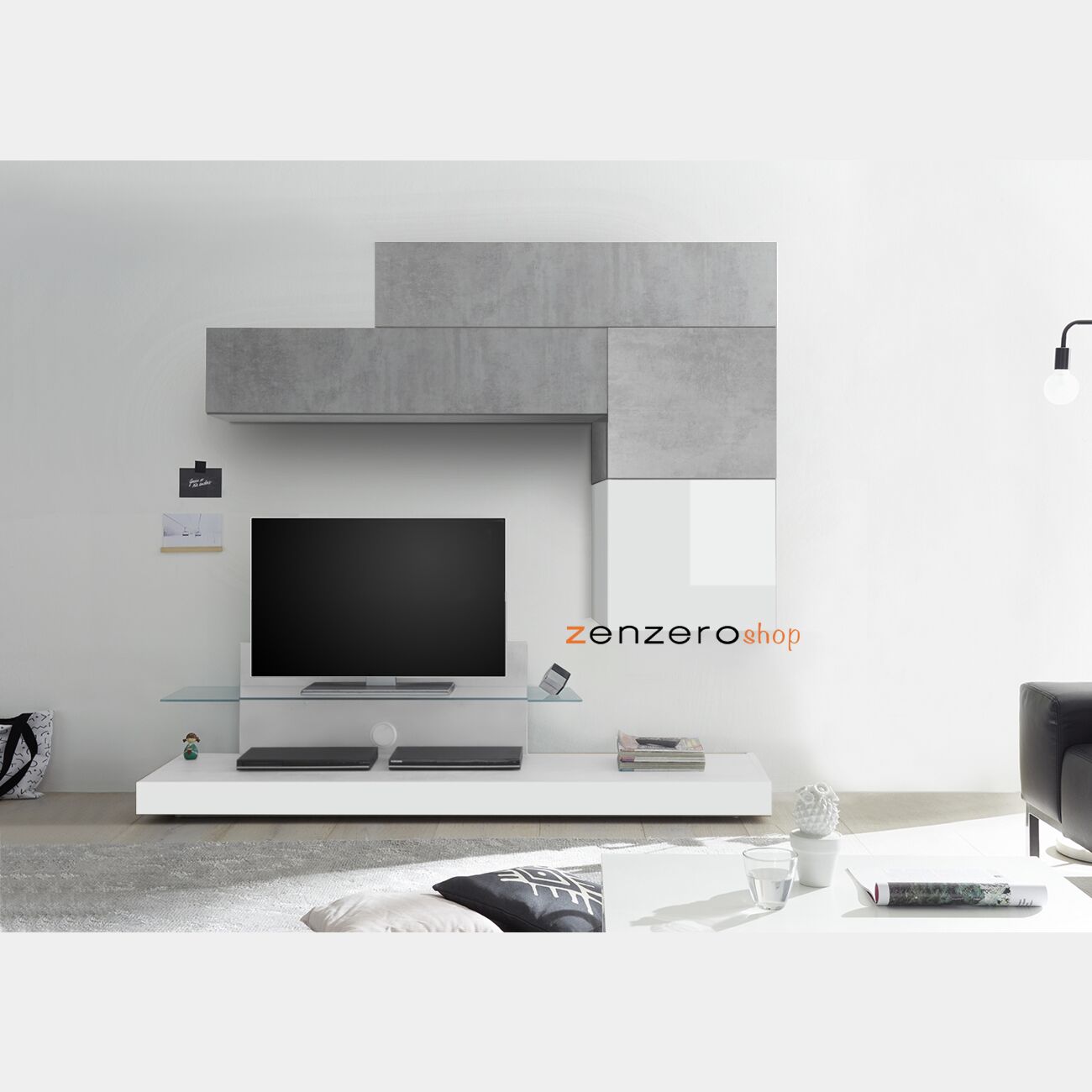 Parete attrezzata Porta TV, Pensili e Cubi, finitura Beton e Bianco Lucido