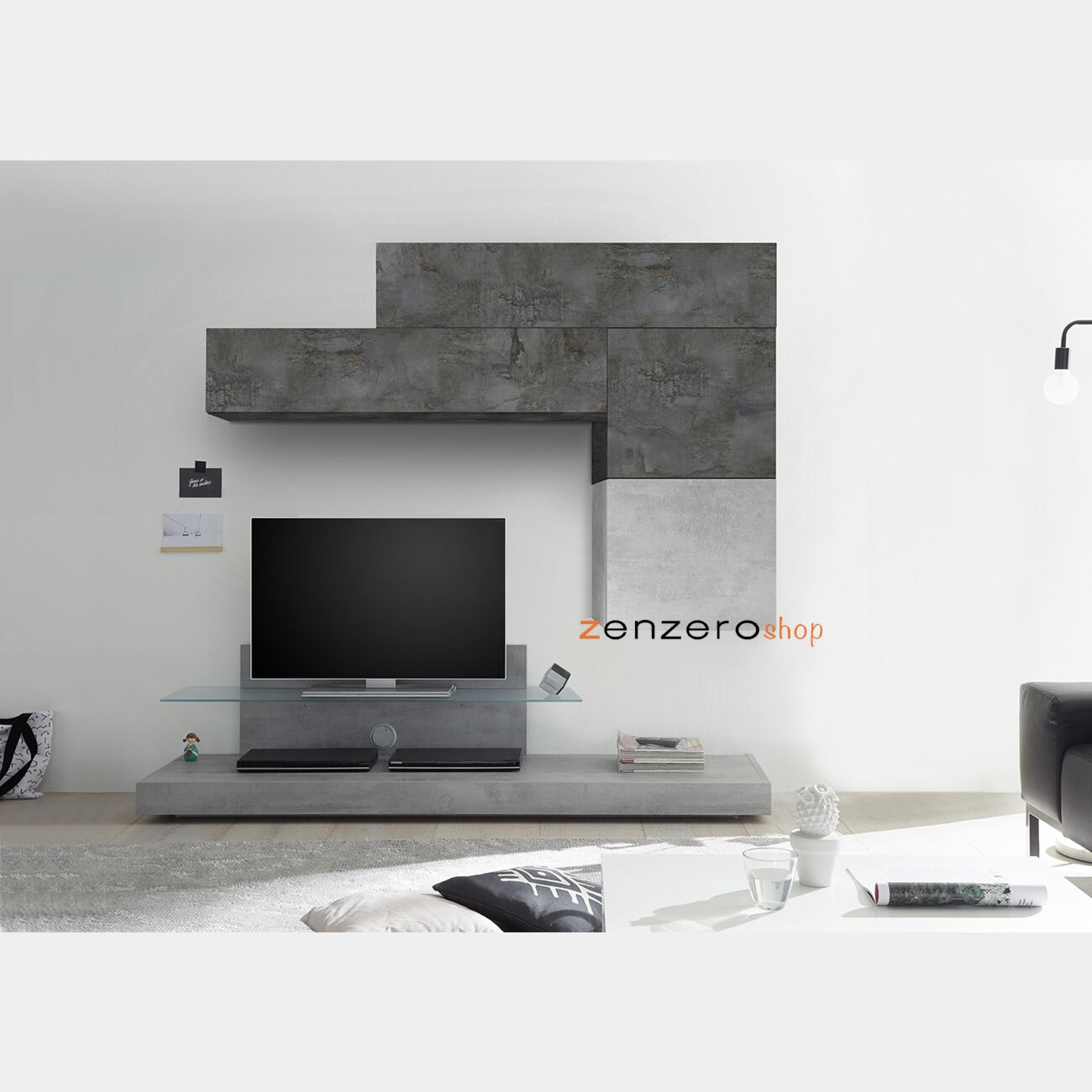 Parete attrezzata con Porta TV, Pensili e Cubi, finitura Ossido e Beton