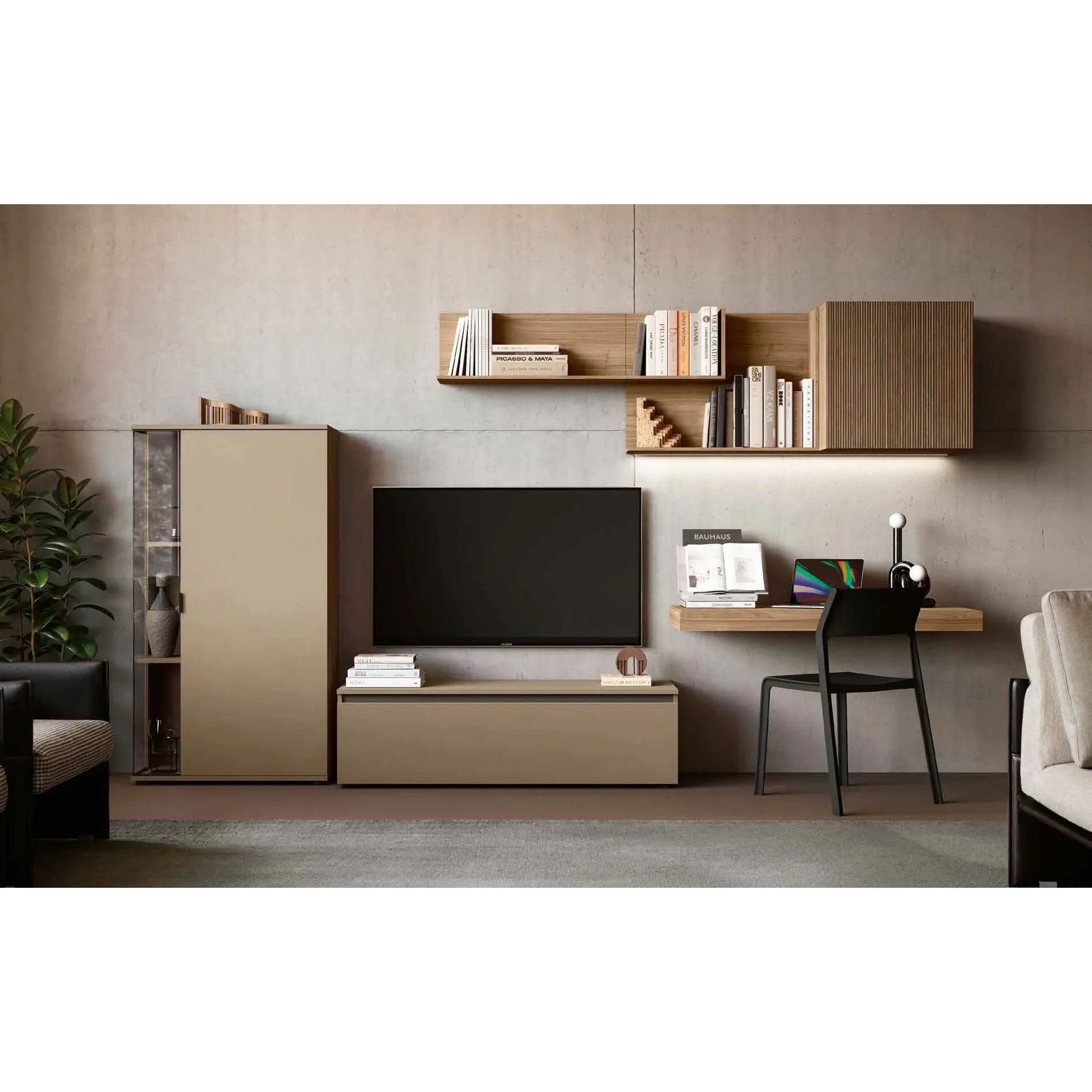 La parete è composta da diversi elementi modulari, tra cui pensili sospesi, vani a giorno e una base contenitiva. Questa modularità permette di personalizzare la composizione in base alle proprie esigenze e allo spazio disponibile.