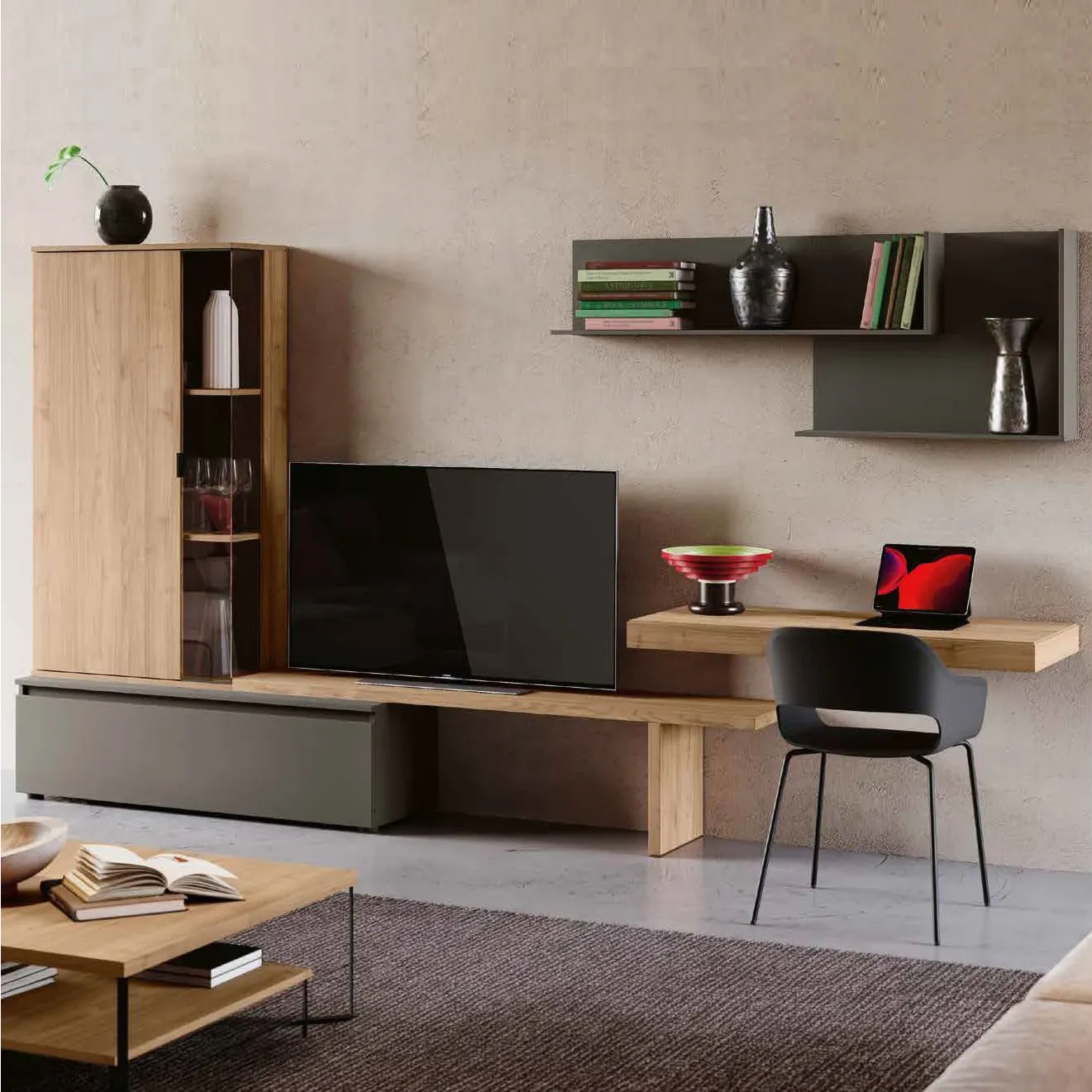 Progettata per ottenere una zona studio elegante e funzionale la parete attrezzata dona al living stile e carattere, assicurando al contempo praticità e spazio contenitivo.