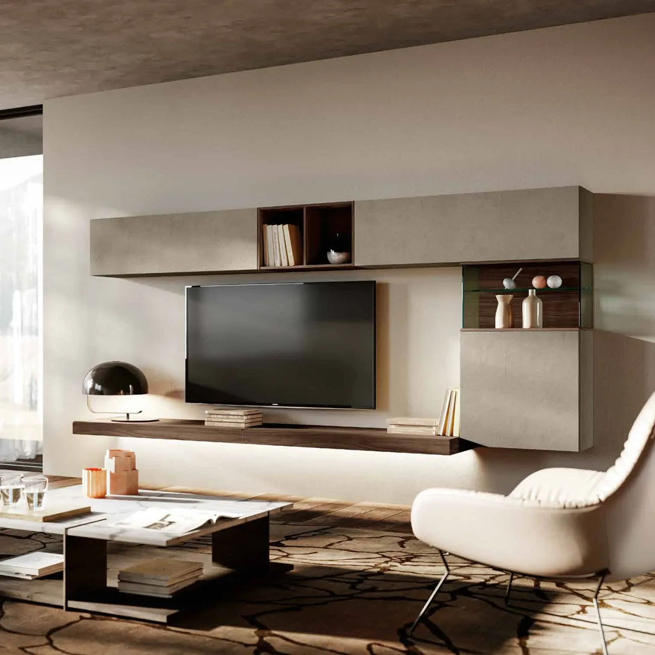 Il gioco di volumi creato da pensili, mensola e teca assicura un arredo unico ed elegante, che ben si adatta a tutti i contesti moderni.