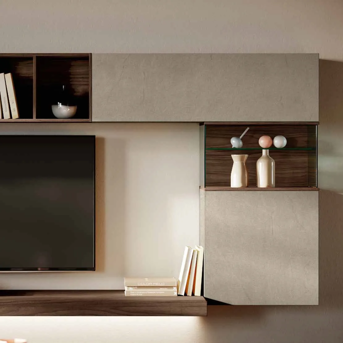 Parete attrezzata con teca, finitura Argilla e Noce moro