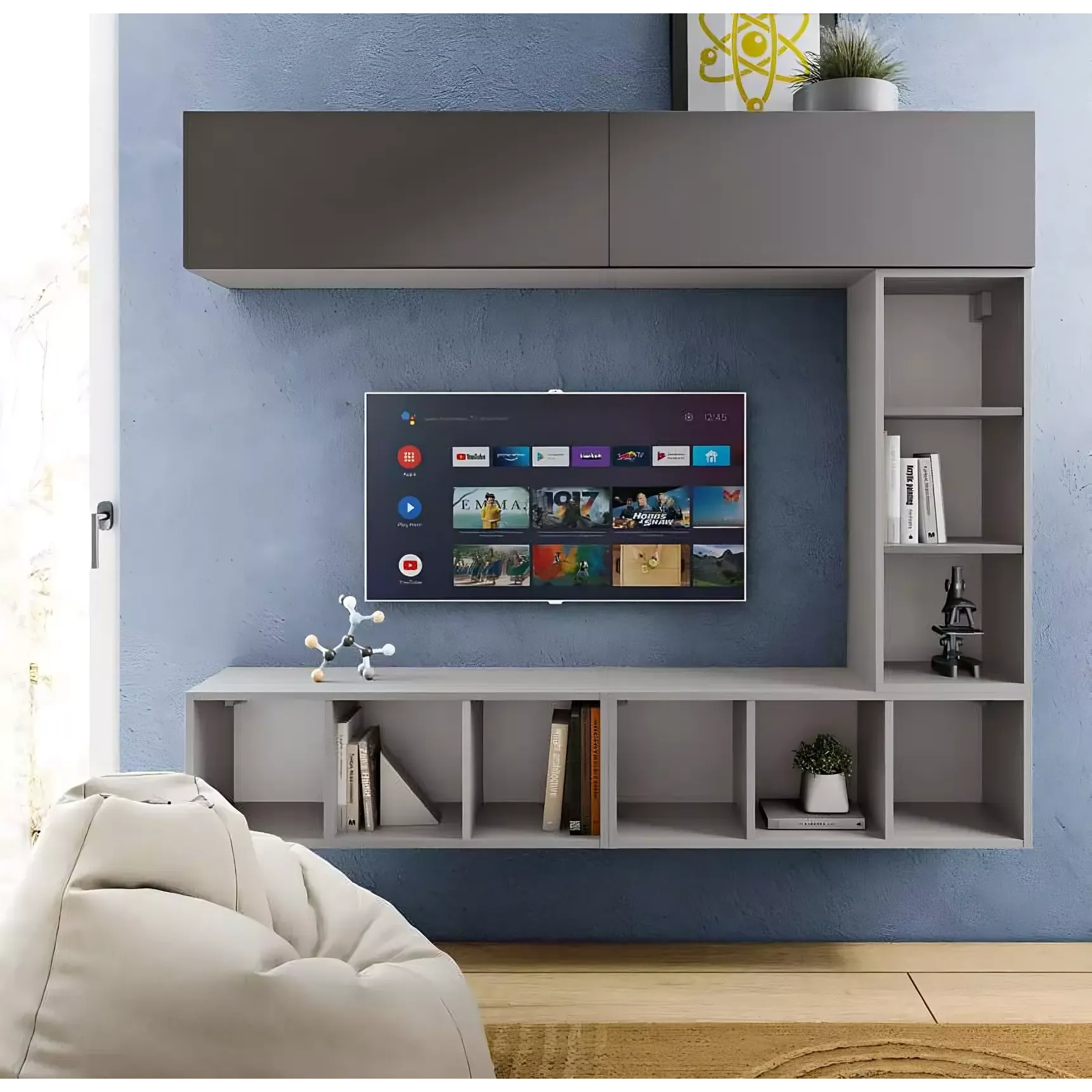 La parete è caratterizzata da tre elementi con vani a giorno e due pensili vasistas; è possibile creare una soluzione d'arredo personalizzata posizionando gli elementi a proprio piacimento.