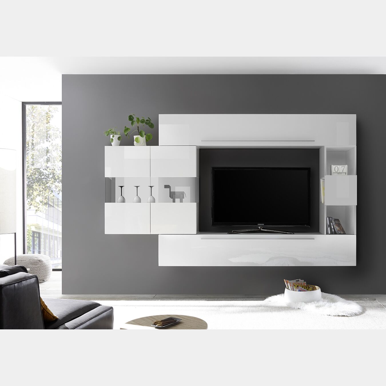 Parete attrezzata con vetrina 2 ante e libreria piccola, finitura Bianco Laccato Lucido
