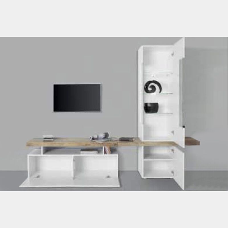 La parete attrezzata è composta da un Porta TV dalla forma geometrica in finitura bianco lucido con un top ardesia che congiunge il porta tv con la colonna vetrina bianca lucida. La vetrina al suo interno ha 4 ripiani; 3 della quale in vetro. Il porta tv invece ha un'apertura a ribalta