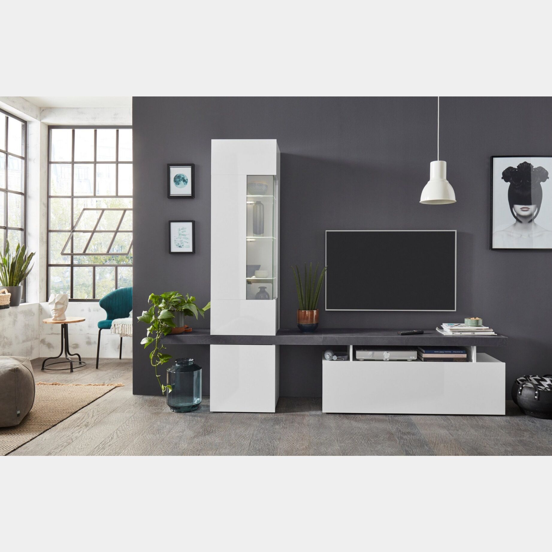 Parete attrezzata con vetrina, Bianco Lucido e Ardesia