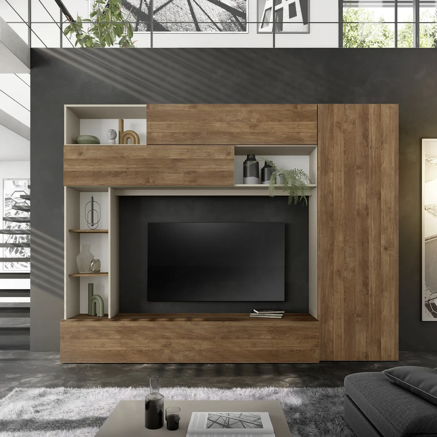 Parete attrezzata estremamente ben accessoriata e carica di confort: possiede 5 vani a giorno, due ribalte, una base cassettone con apertura a vasistas e una colonna larga da porre a lato. Mescola perfettamente praticità e design raffinato.