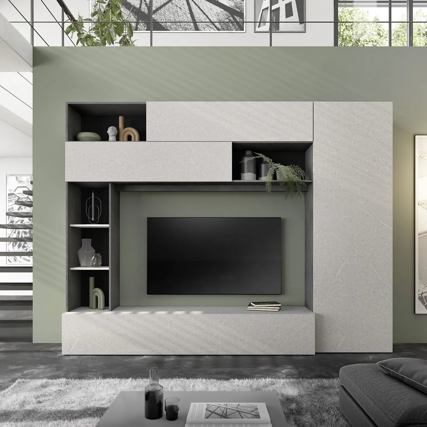 Parete attrezzata variamente colorata grazie alla scelta di combinare assieme i colori Pietra e Ghisa, i quali conferiscono al mobile un effetto di naturalità difficilemente ottenibile e riscontrabile in altri prodotti.