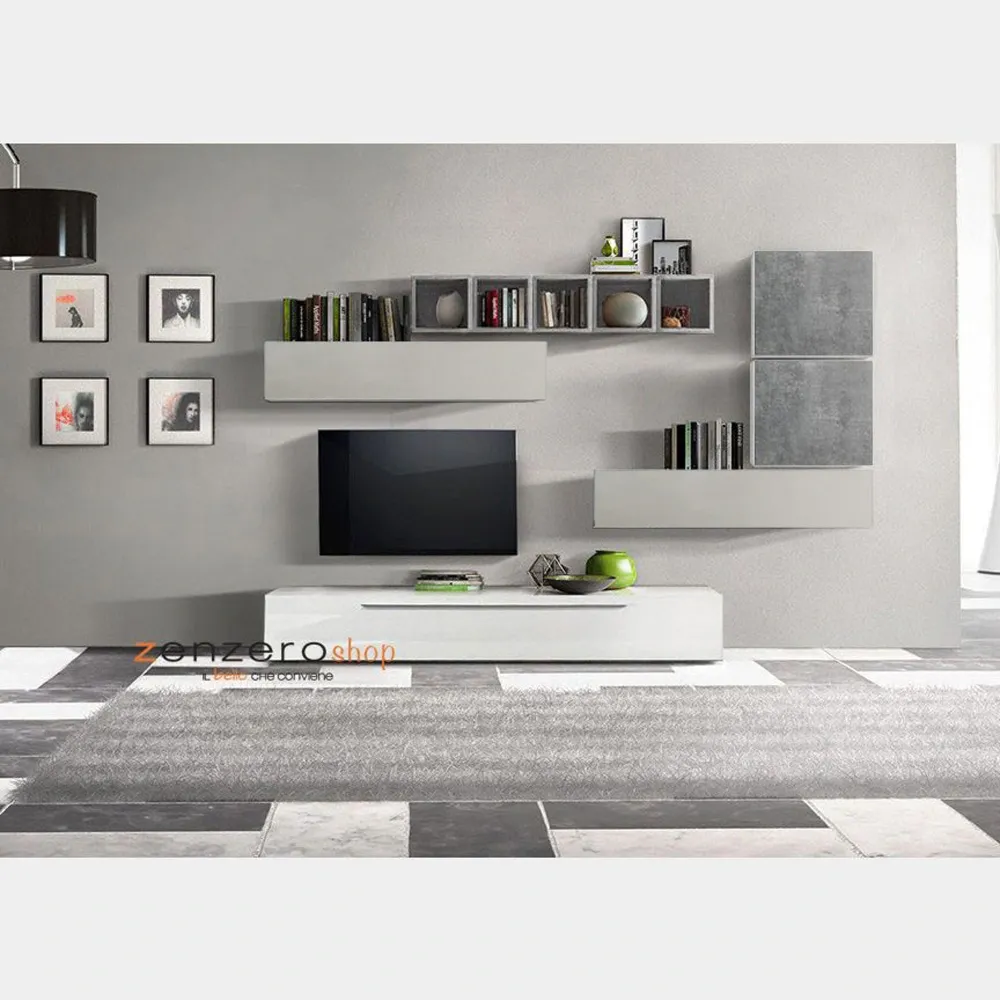 Con la sua semplicità, arredare con qualità non è mai stato cosi vantaggioso, la parete in bianco lucido e rovere grigio, come in foto, è formata da una base, uttilizzabile anche come porta tv e pensili sospesi