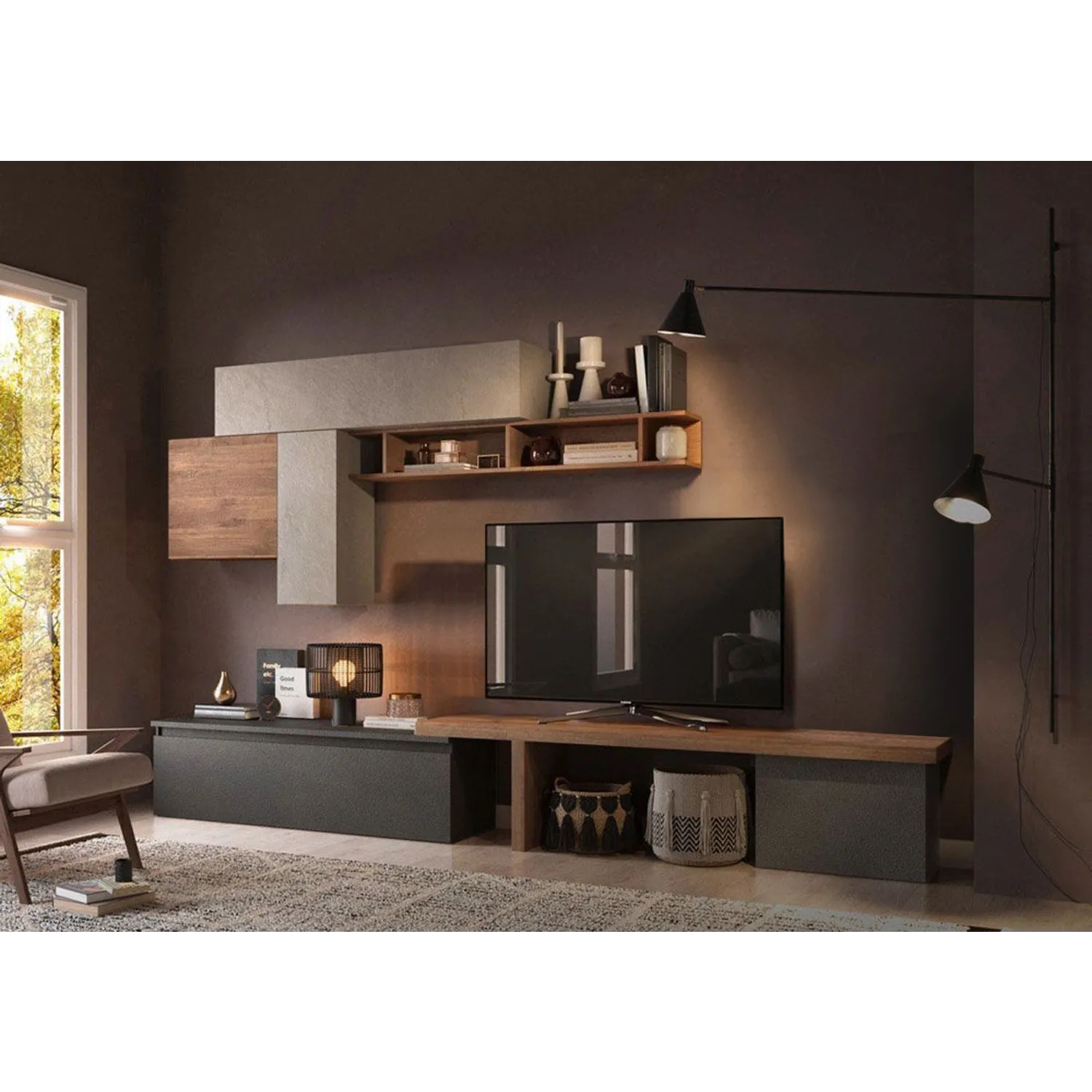 Facile! Dotarsi di una elegante e funzionale Parete Attrezzata, Mercure, Lava e Argilla dove riporre libri, televisore e, nello stesso tempo, contenere quello che non vuoi tenere in giro per casa.