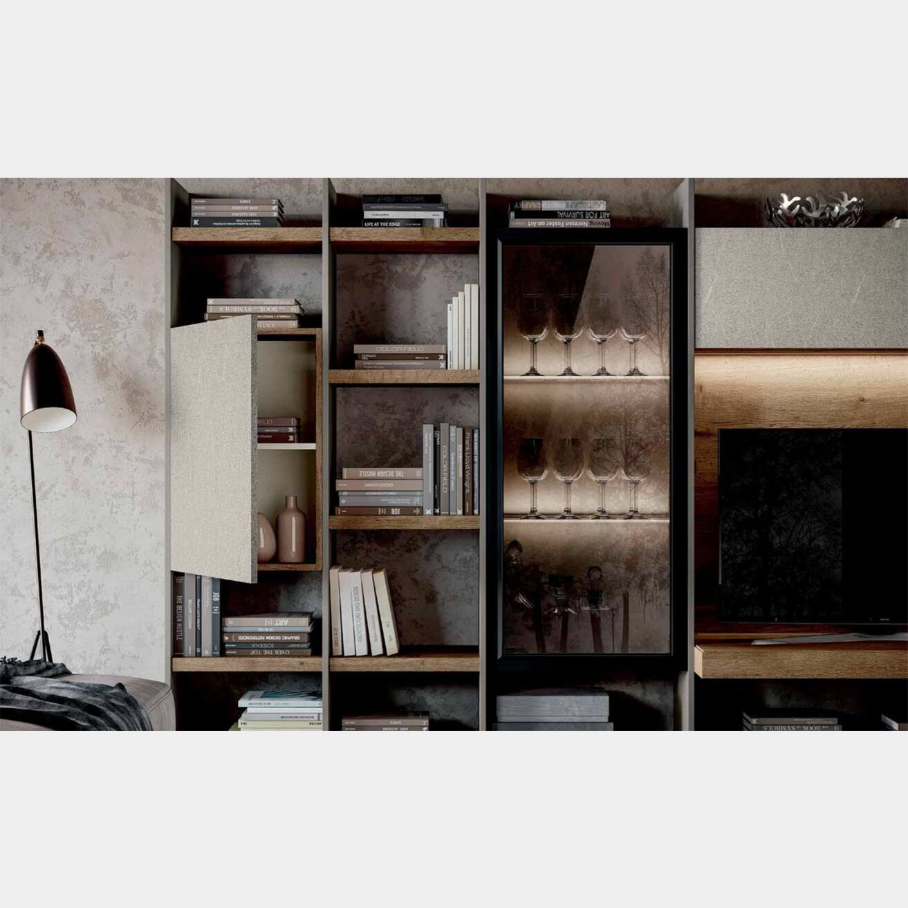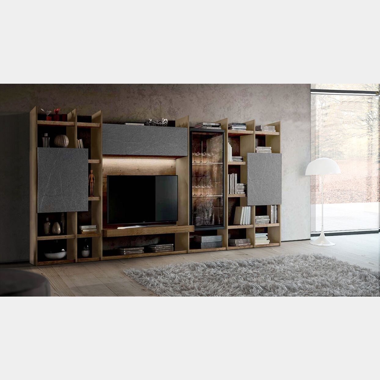 Parete attrezzata di alta qualità in finitura Bronzo, Graniglia scura e Rovere tabacco