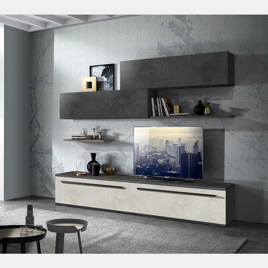 Parete attrezzata di design Made in Italy, con finitura in Argilla e Resina dark