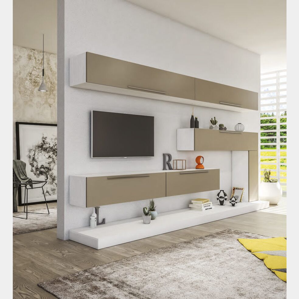Parete attrezzata finitura Bianco Frassino, elementi sospesi e in appoggio con frontali in finitura Visone