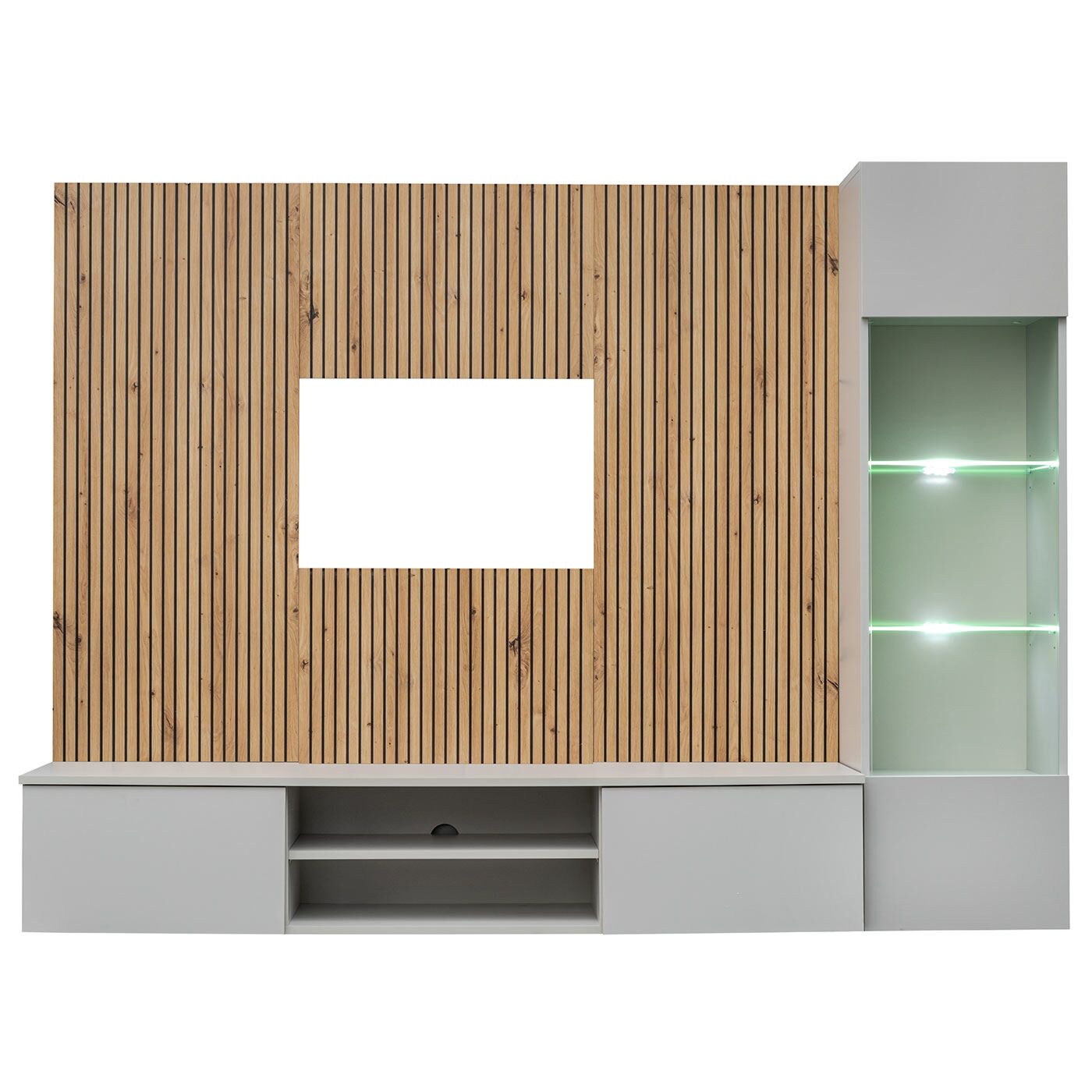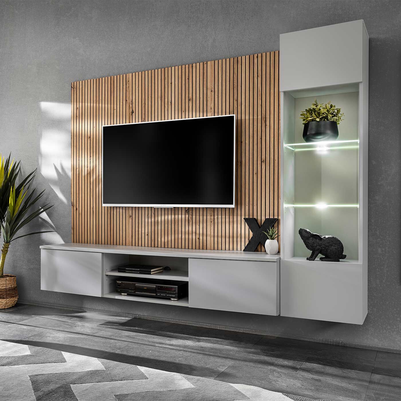 Parete attrezzata sospesa con pannello in cannettato, 200x35x148 h cm, Grigio perla e Artisan oak