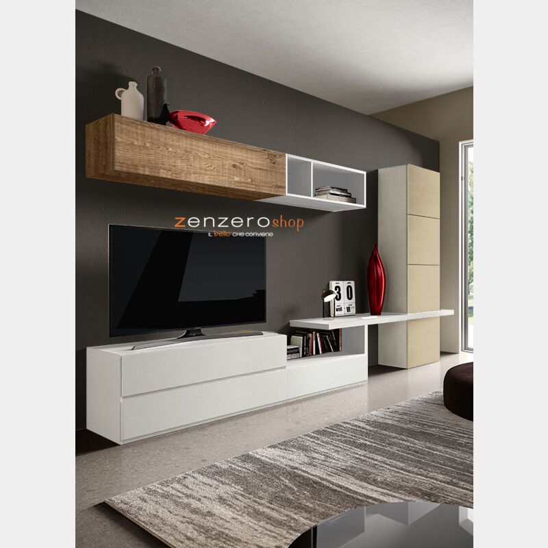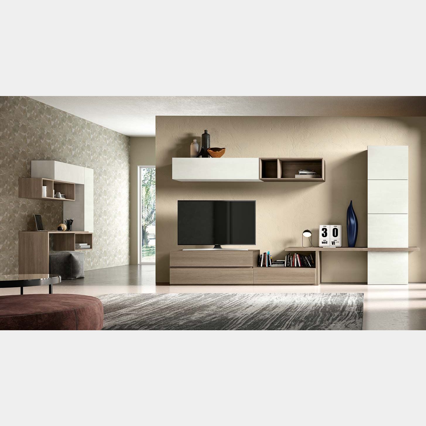 La parete attrezzata Harriot è formata dall'unione di più elementi collegati tra loro per offrire praticità e funzionalità al 100%. Sono presenti 3 cassetti dotati di chiusura rallentata, una mensola, un totem con 3 ante, un cubo con un'anta, un elemento vasistas e un elemento vano a giorno. Tutte le ante sono dotate di sisistema di apertura push and pull.