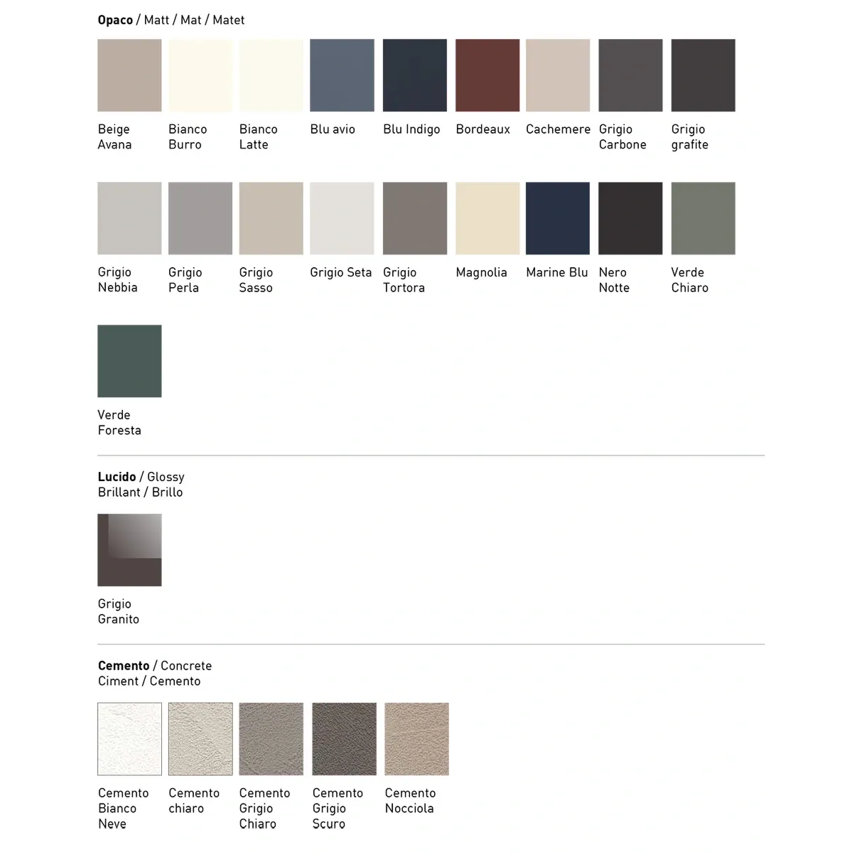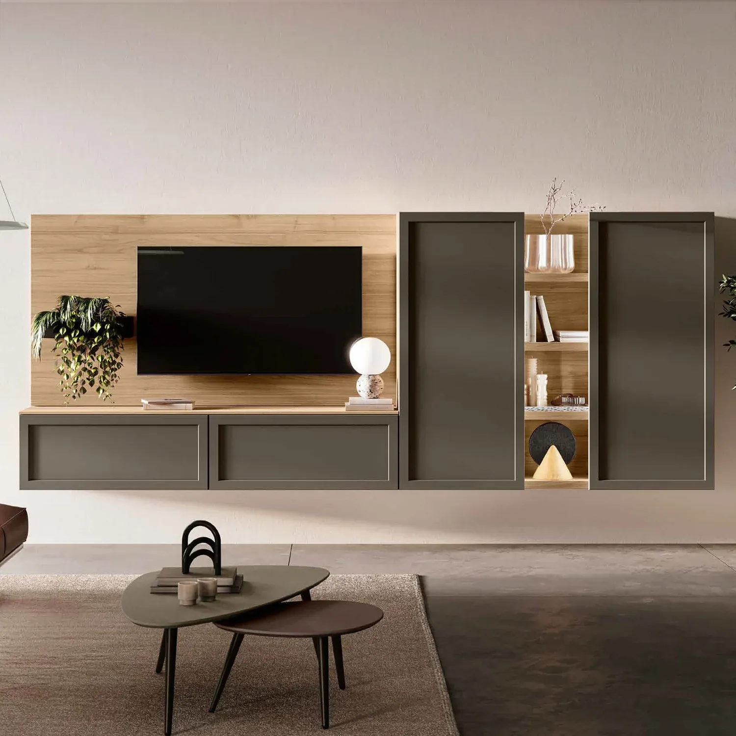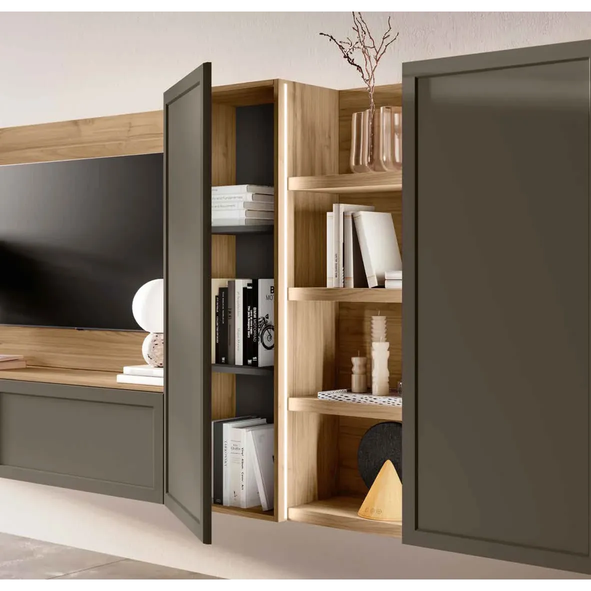 Le finiture Grigio carbone e Noce biondo possono essere sostituite con le tinte disponibili a campionario, per personalizzare al meglio la parete e adattarla alla propria zona giorno.