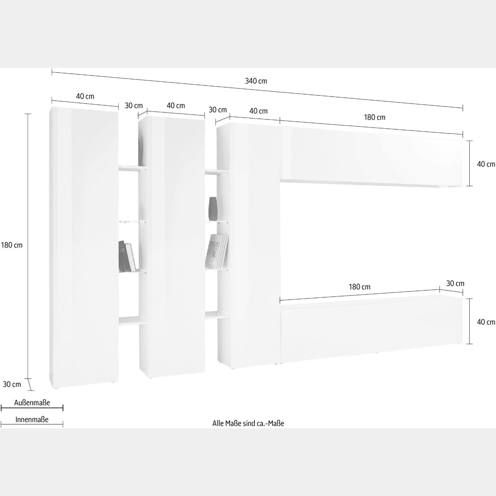 Parete attrezzata L.340 cm, finitura Bianco lucido, Made in Italy