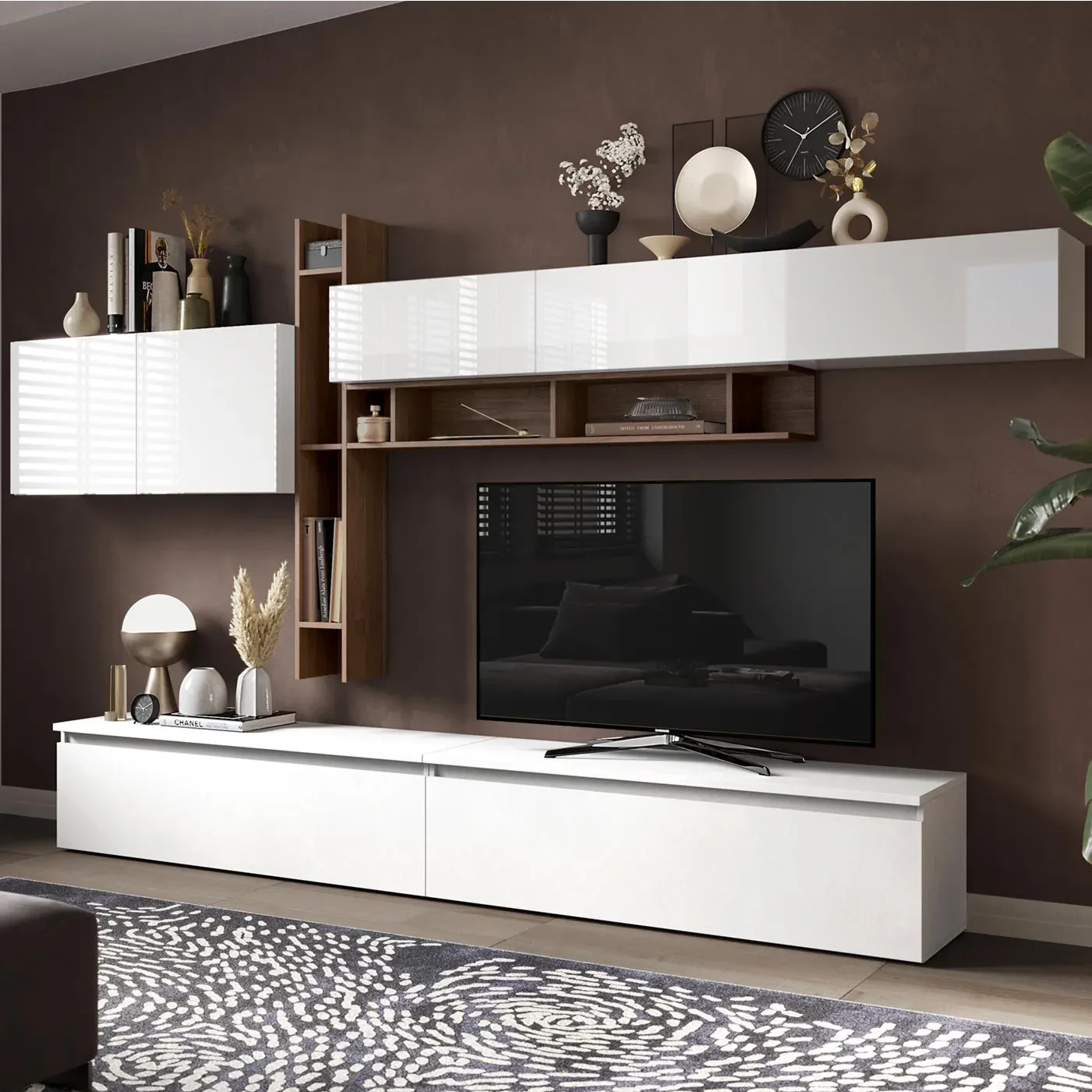 Eleganza e design sono le parole chiave di questa zona living caratterizzata dalle sue finiture uniche. L'accostamento delle tinte Bianco lucido e Mercure creano un netto contrasto che cattura l'attenzione e rende la parete attrezzata protagonista della zona giorno.