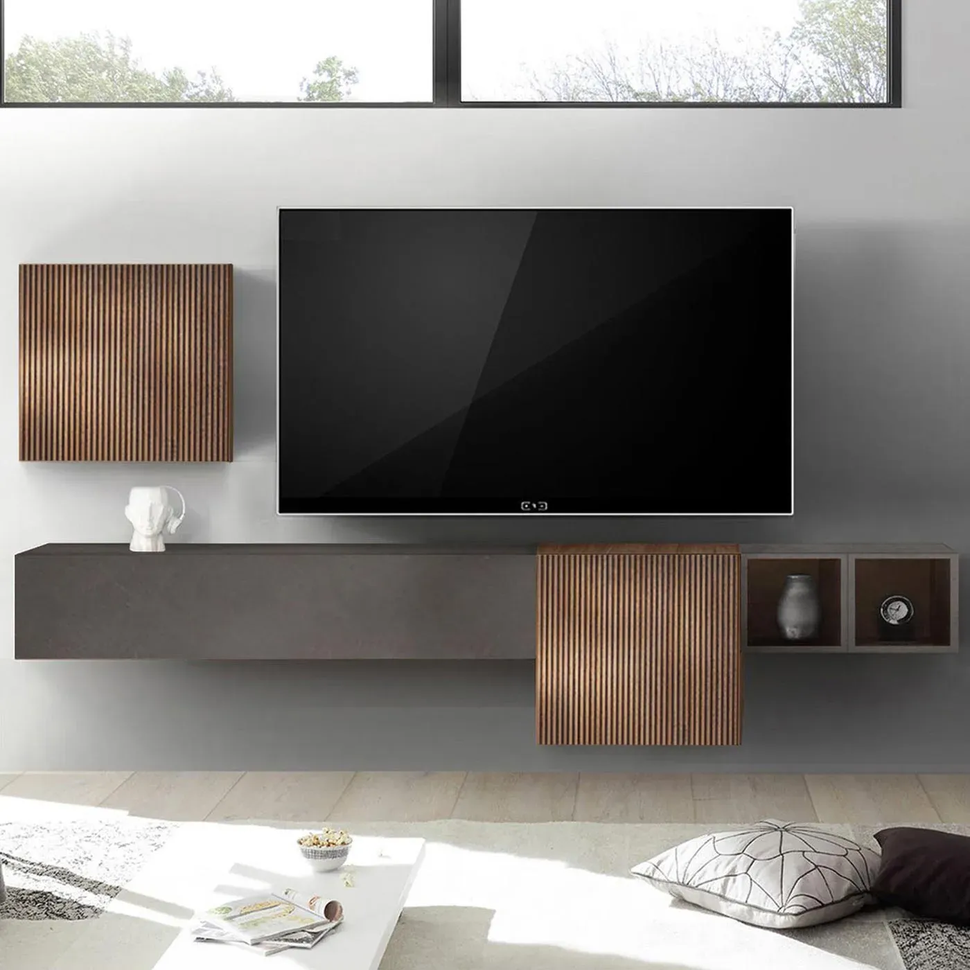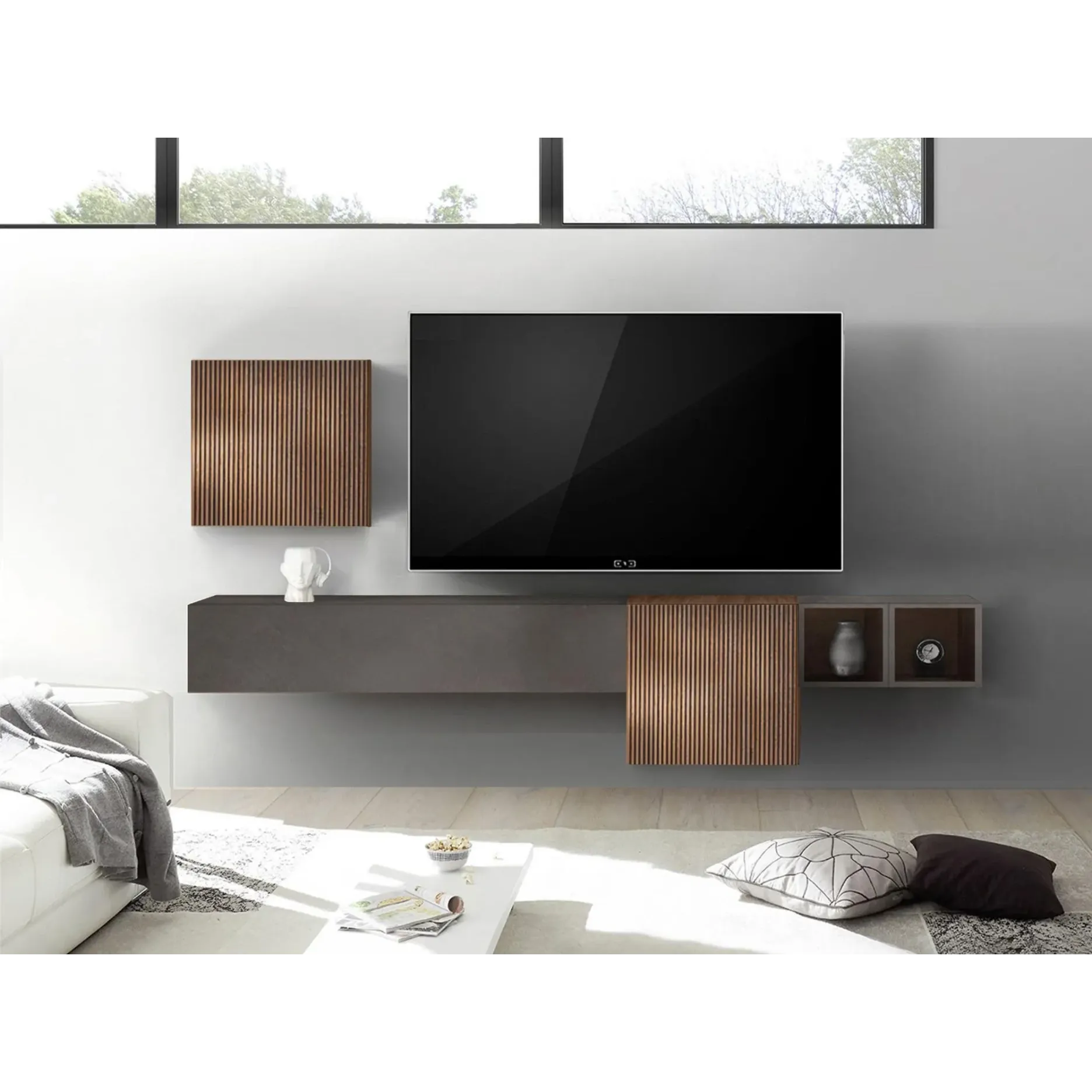 Nuova idea di parete attrezzata sospesa, è una proposta 100% made in Italy. La parete attrezzata, fresca e moderna si adatta a tutti gli ambienti per offrire alla tua zona living un tocco di tendenza. E' una collezione modulare, i singoli elementi si possono posizionare a piacere. NOVITA' ...NELLE RIBALTE ORIZZONTALE IN FASE DI MONTAGGIO SI PUO SCEGLIERE DI AVERE L'APERTURA VASISTAS