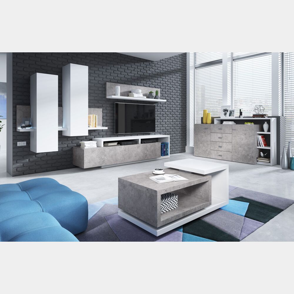 Questo mobile porta tv nasce per chi vuole portare nel proprio ambiente uno stile minimal e moderno, caratterizzato dal contrasto del colore bianco opaco con il grigio cemento, caratteristica che rende ogni complemento perfetto per essere integrato a qualsiasi tipologia d'arredo.