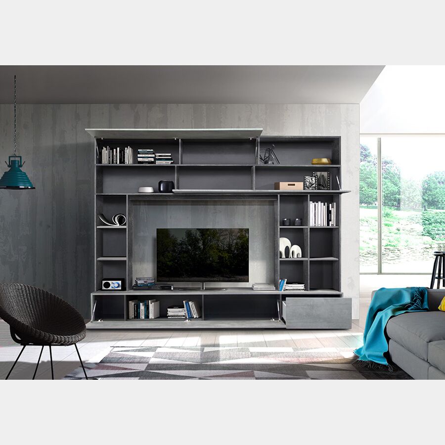 Con la sua semplicità, arredare con qualità non è mai stato cosi vantaggioso, la parete attrezzata è in Beton, Ossido e Grigio, come in foto, è composta da una base con struttura Ossido e dotata di anta a ribalta e cassetto, tutto con guide e cerniere in metallo. L'interno della base è in finitura Grigia. Sopra alla base ci sono due piccole librerie a 6 ripiani. Nella parte superiore della parete ci sono due vani a giorno con interno in finitura grigia e fianchi in ossido e una ribalta e un pensile vasistas con interni grigi e frontali beton.