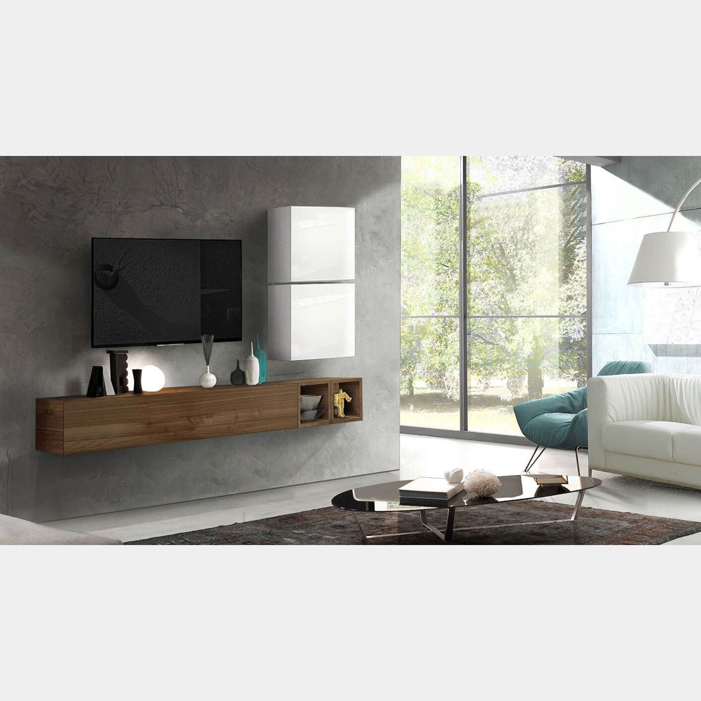 Parete soggiorno con 1 pensile orizzontale, 2 cubi e 2 vani; forme logiche e rigorose risalteranno il vostro soggiorno.