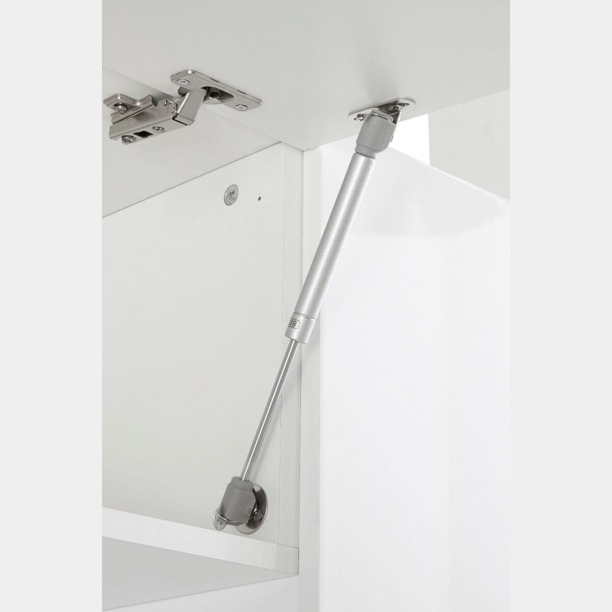 Parete attrezzata moderna, con pensile vasistas, mensole in vetro, finitura bianco lucido e ardesia