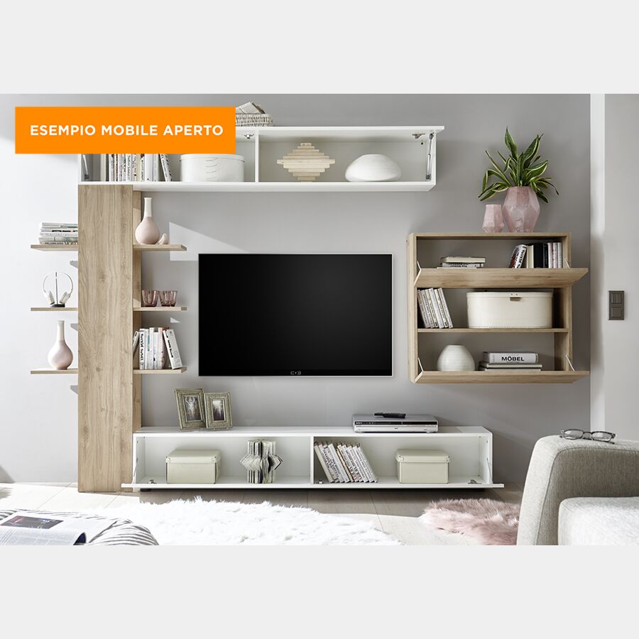 Parete attrezzata, con 1 ribalta, 1 Vasistas, 1 pensile con vano a giorno piccolo + 2 ribalte e colonna con libreria, finitura Bianco laccato lucido