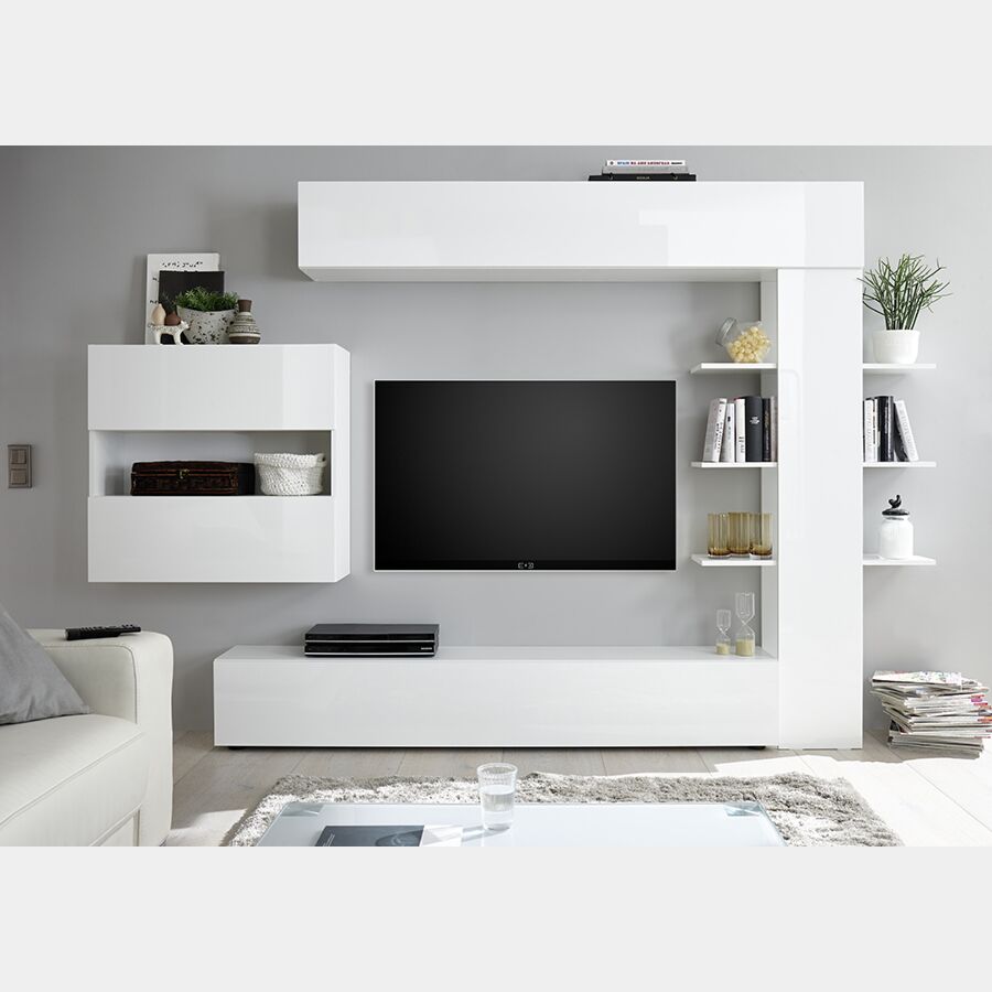 Comoda, rubusta e di design: adatta ad una casa moderna e funzionale, questa parete attrezzata si distingue per la grande varietà di elementi uniti e per la finitura pulita bianca lucida.
