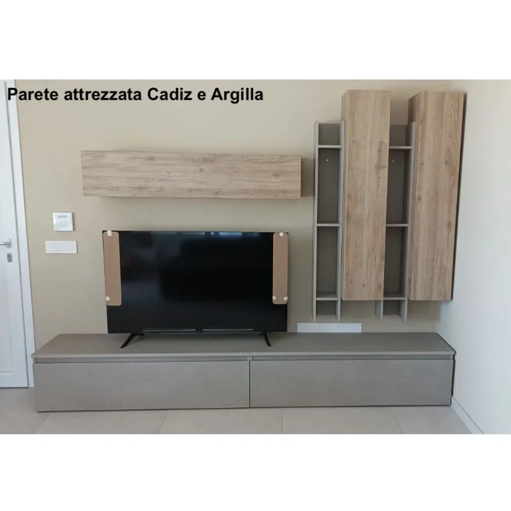 La Parete attrezzata è proposta in una originale finitura Mercure e Argilla, ed è un mobile che saprà valorizzare al meglio la zona living di casa tua, donando un tocco moderno a tutto l'ambiente, grazie al suo design ricercato ed elegante.