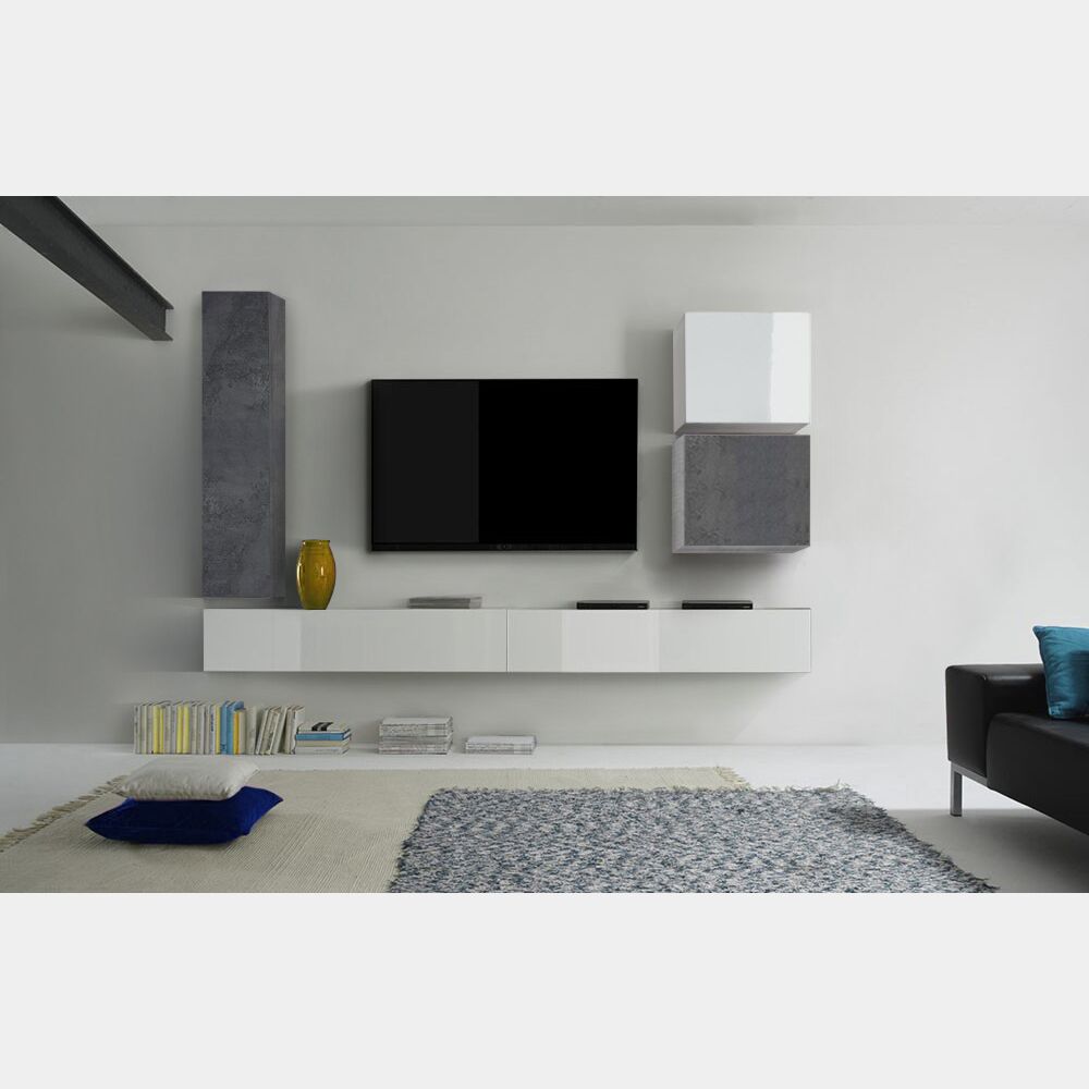 Parete attrezzata bianco laccato, Ossido e Beton; forme logiche e rigorose risalteranno il vostro soggiorno, e il colore bianco, moderno, darà luminosità al vostro spazio quotidiano.
