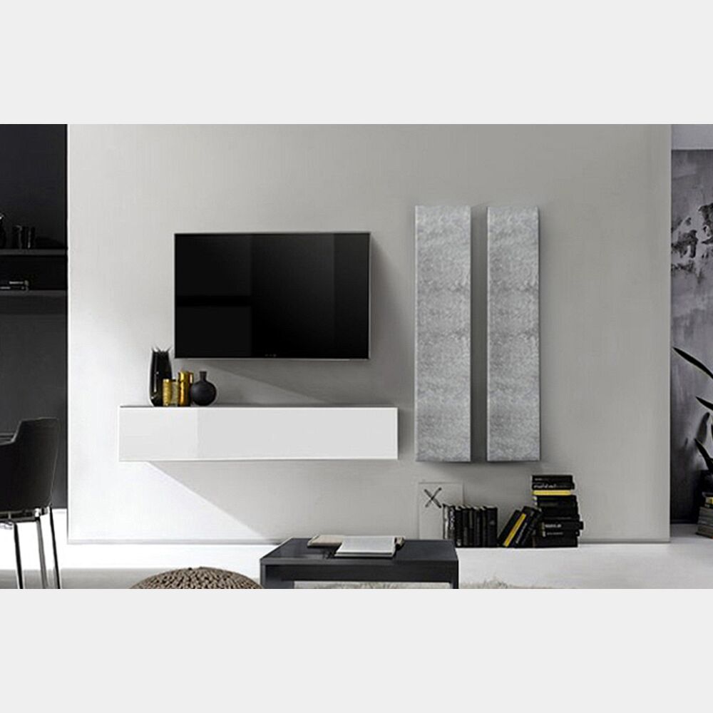 Parete attrezzata in bianco laccato e beton, le forme logiche e rigorose risalteranno il vostro soggiorno, e il colore bianco, moderno, darà luminosità al vostro spazio quotidiano.