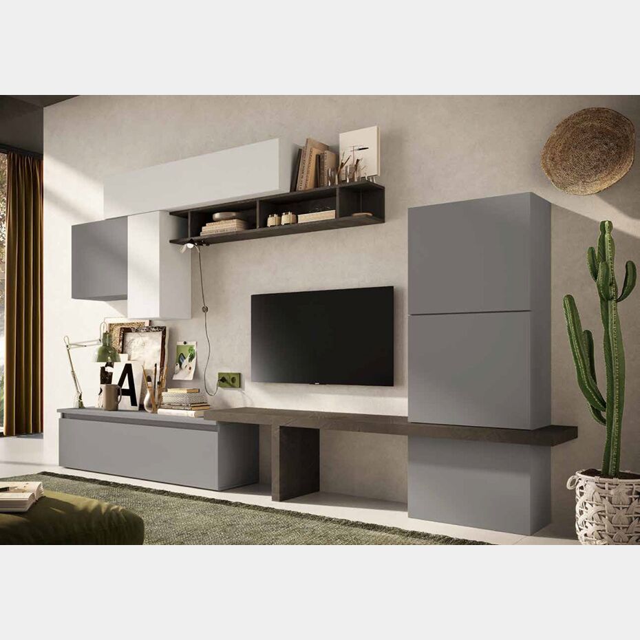 L'attenzione dei tuoi ospiti sarà catturata dalla Parete Attrezzata finitura Gesso, Bronzo e Bianco Lucido che grazie alla sua capienza e originalità diventerà la protagonista della zona living!