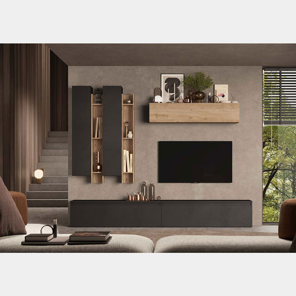 Parete attrezzata moderna con base a 2 cassetti e pensili sospesi, in finitura Lava e Cadiz, personalizzabile. Aggiungi altri elementi al tuo soggiorno oppure vedi tutta la collezione Logica.